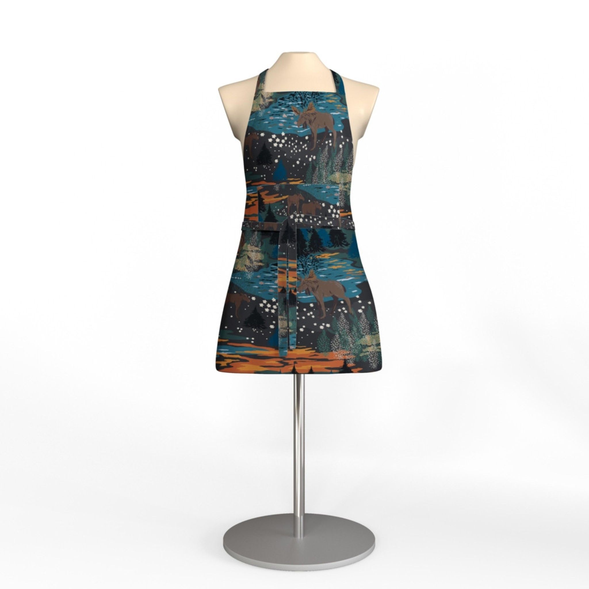 Älgrike brun/orange förkläde med ficka från Arvidssons Textil – designat av Louise Videlyck. Ett praktiskt, stilfullt förkläde i bomull som passar köket lika bra till vardag som till fest. Det varma bruna och orangea mönstret med älgmotiv ger ett naturnära uttryck i hemmet.