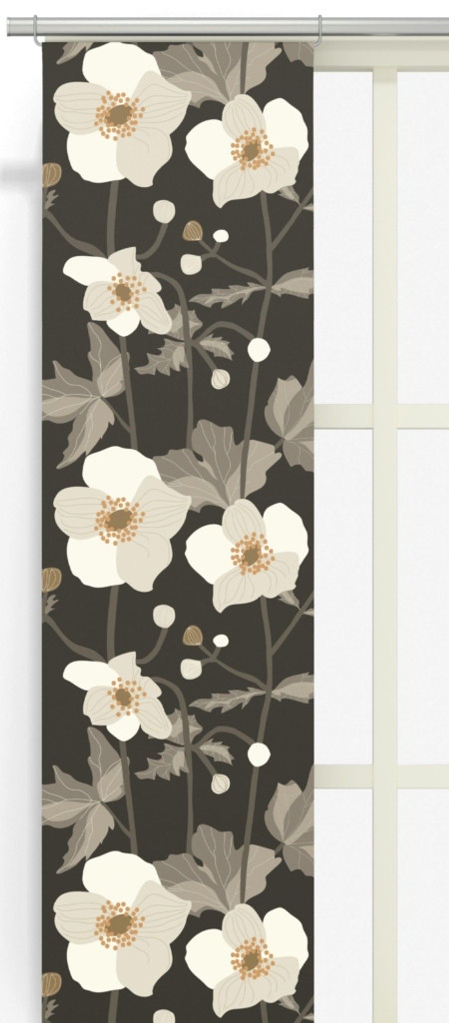 Anemon grå panellängd 2-pack från Arvidssons Textil är en stilren gardinpanel i tvåpack, designad av Linda Svensson Edevint. Den eleganta blomsterdesignen med vita anemoner mot en mörkgrå bakgrund ger rummet ett mjukt och modernt uttryck och passar både i sovrum och vardagsrum.