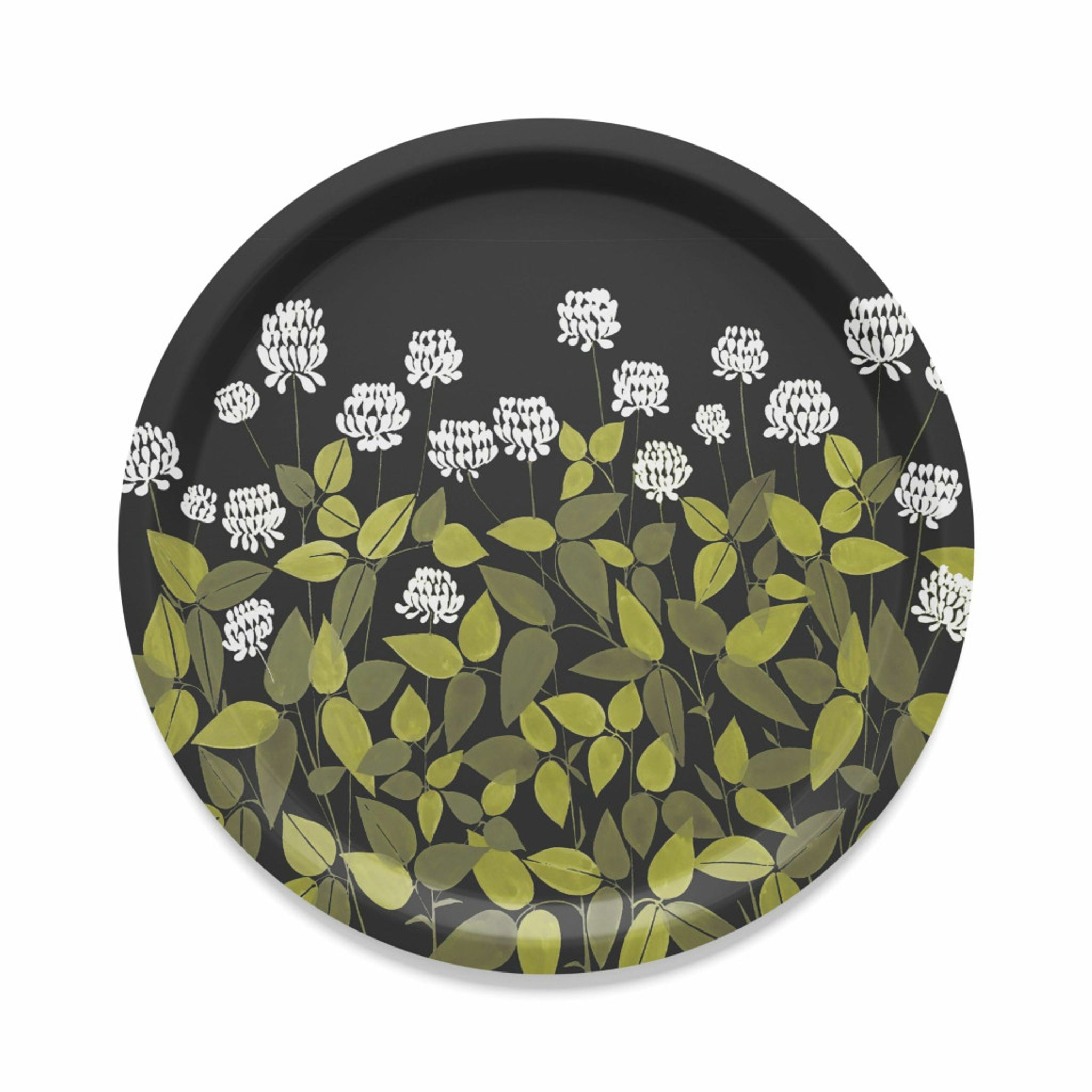 Ängsmark svart rund bricka från Arvidssons Textil i björkfanér. Denna eleganta bricka kombinerar naturliga material med ett blomstrande mönster och passar för servering, dekoration eller som en stilfull detalj på bordet.