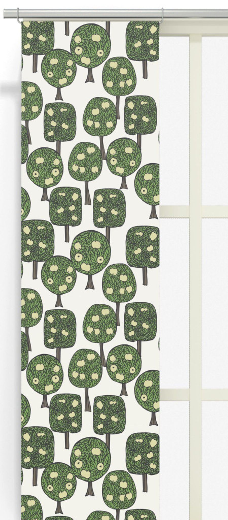 Äppelskogen-mönstret med rundade träd och naturliga nyanser ger ett mjukt, lättskött uttryck som kompletterar både moderna och klassiska inredningar.
