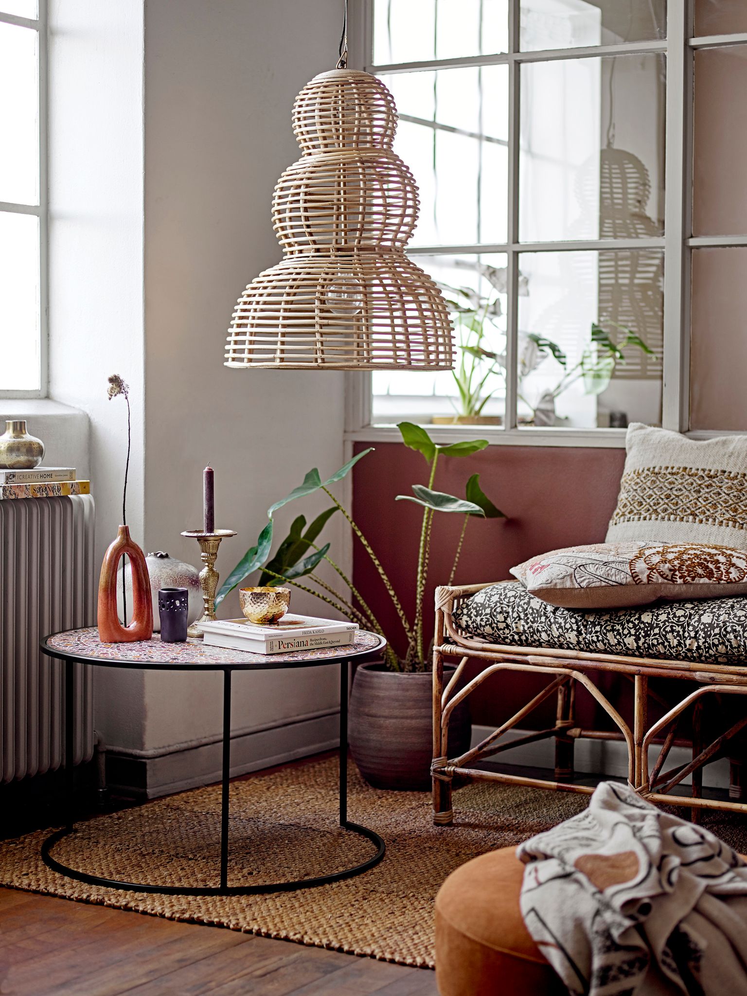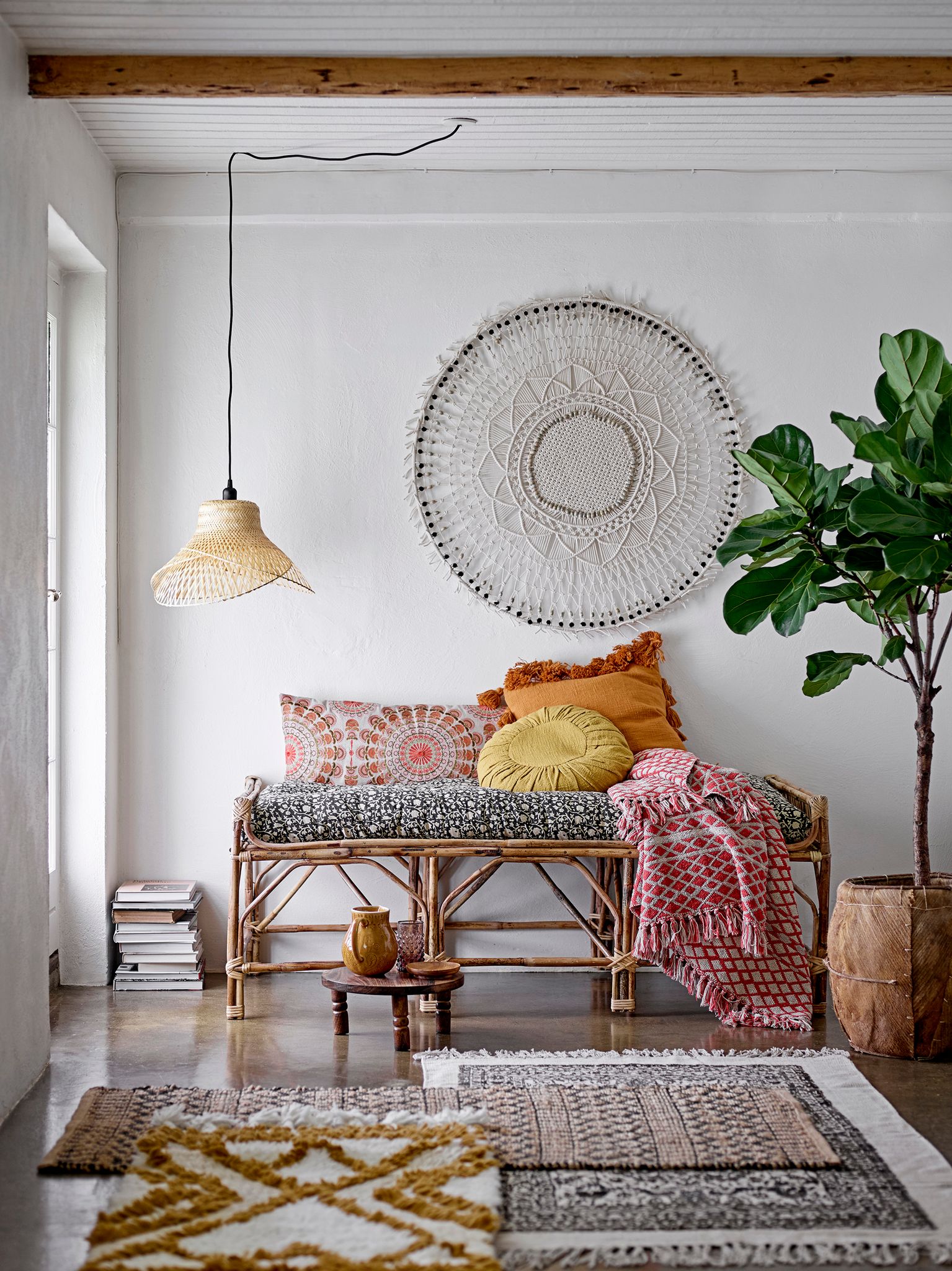 Bänken är lätt att flytta och kan stylas med kuddar eller pläd för mer komfort. Observera att variationer kan uppstå på grund av naturmaterialet. Skötselråd: torka av med en fuktig trasa. Låt denna Bloomingville Pammi Cane-bänk förbättra ditt hem.