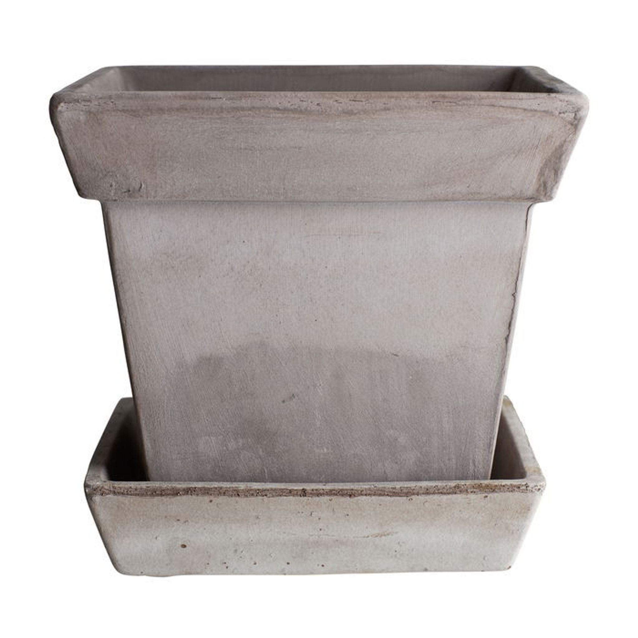 Den här krukan med fat i terrakotta från Gaia RAW är en grå, kvadratisk planter som fungerar både inomhus och utomhus. Den passar bra mot väggar och i hörn, och hjälper dig få plats för växter även i mindre ytor.