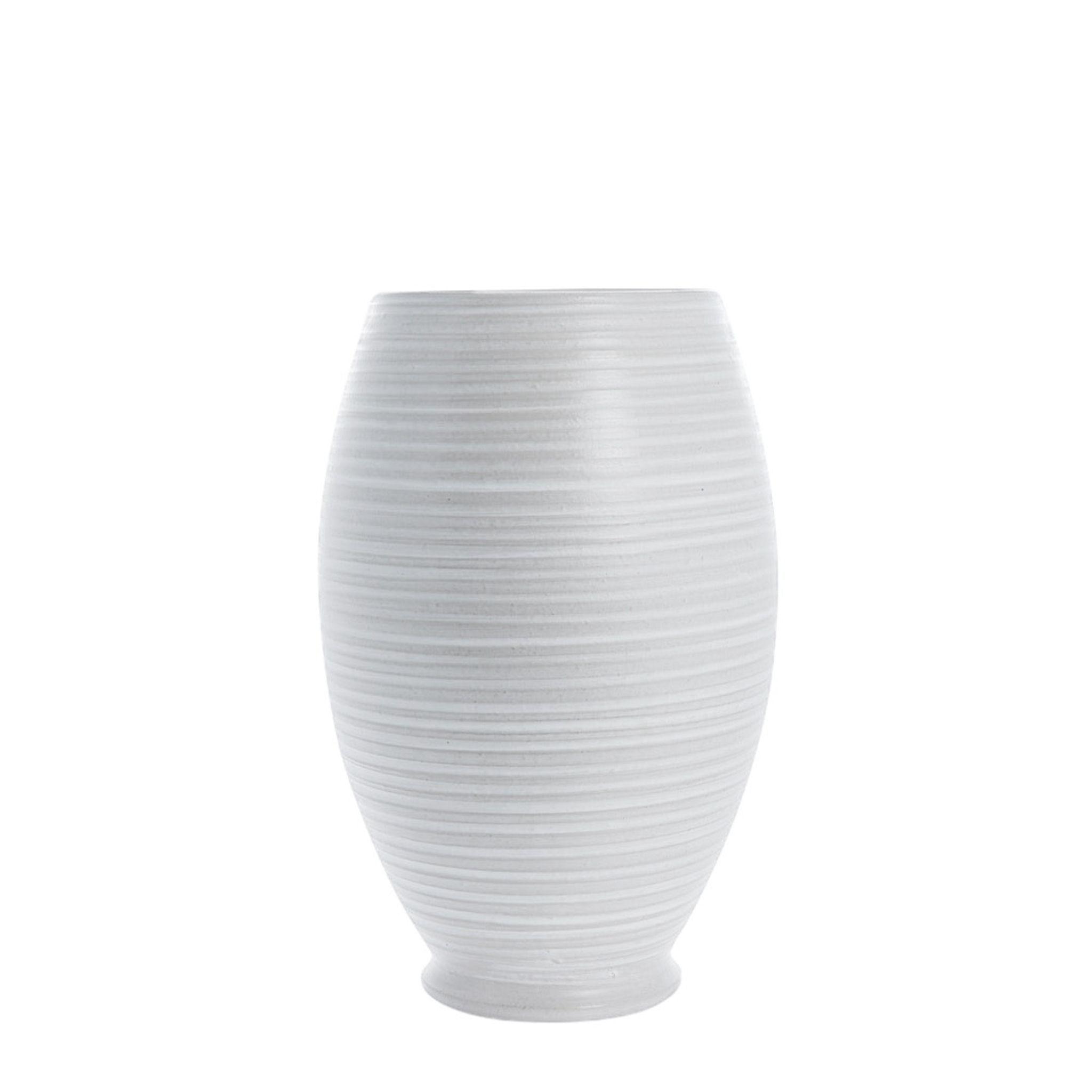 Blomkrukan är i keramik och har måtten 22x22x35 cm (diameter 22 cm, höjd 35 cm). Den benvita ytan och de diskreta fårorna ger struktur utan att ta över, så dina blommor får fokus.