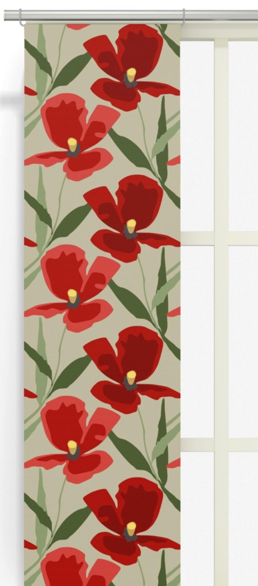 Blomsterskrud (culla) röd panellängd 2 pack från Arvidssons Textil ger dina fönster ny färg och karaktär. Den stora röda blomsterdesignen mot en neutral bakgrund skapar en tidlös och inbjudande känsla i kök, vardagsrum eller sovrum.