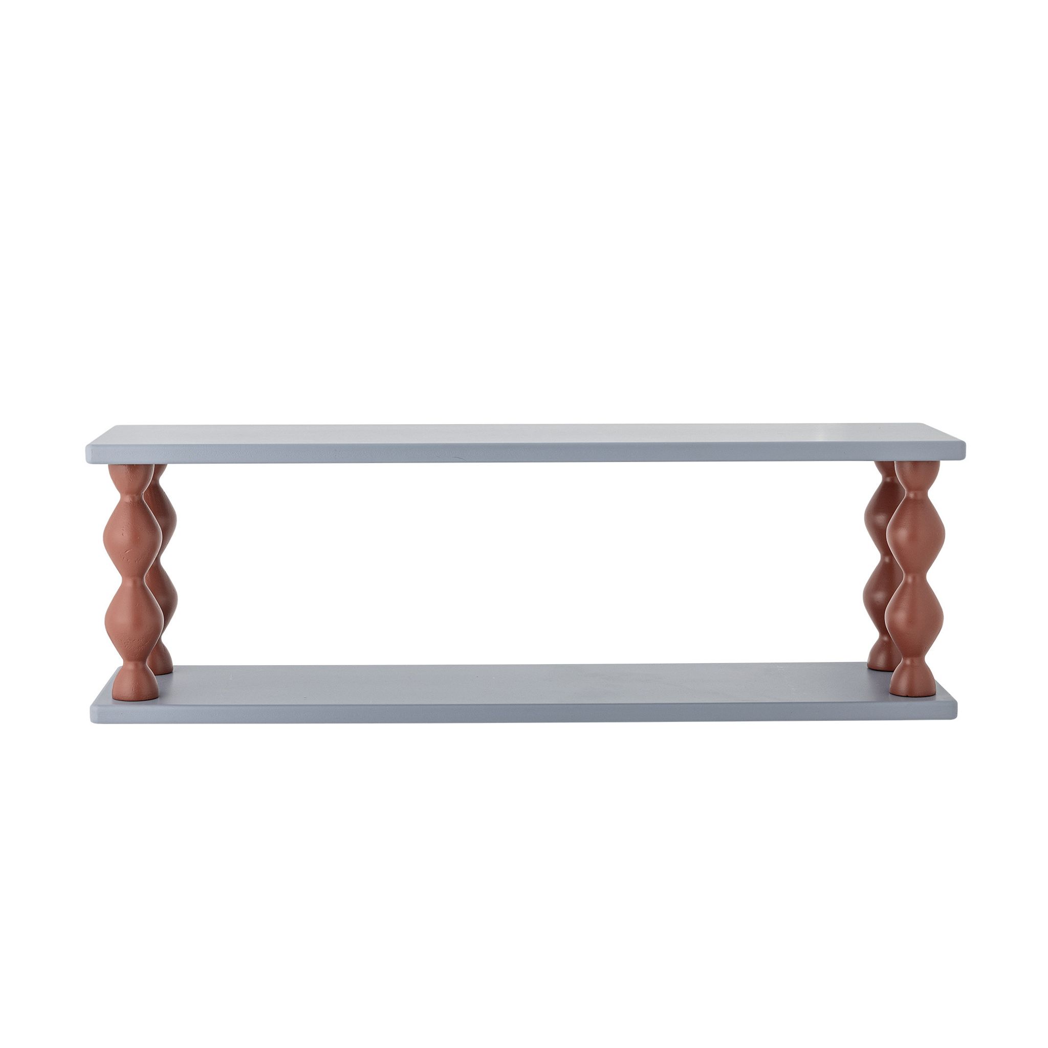 Upptäck Bibiola Hylla Blå MDF från Bloomingville Mini – en lekfull tvånivåhylla som förenar stil med praktisk förvaring. Den blå MDF-skivan ger en modern bas medan de vridna benen i terrakottafärg tillför karaktär och färg i varjerum.