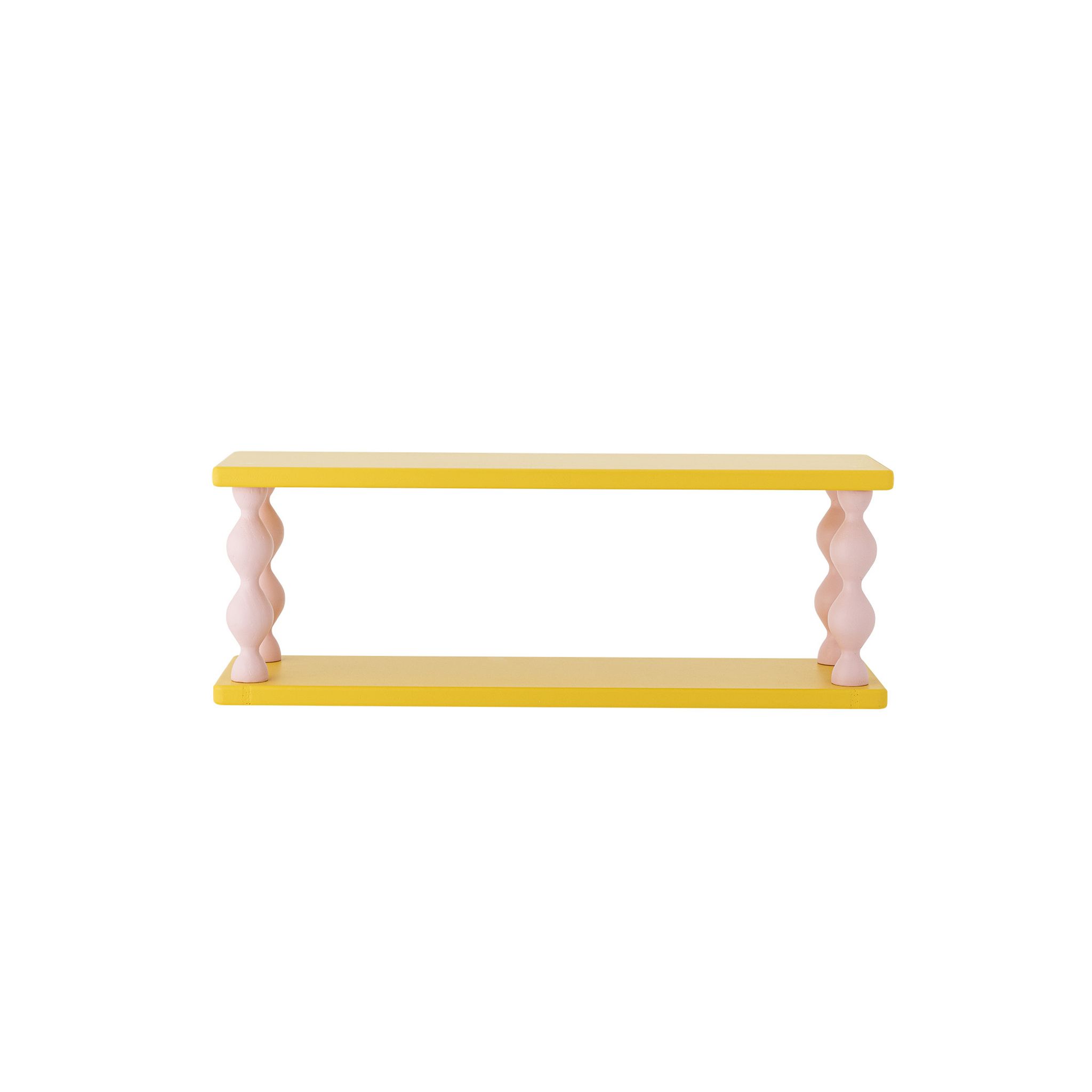 Bibiola Hylla Gul MDF 329 cm Bloomingville Mini är en lekfull och färgstark förvaringslösning som passar barnrum, lekrum eller vardagsrum. Den glansiga gula färgen kombineras med två rosa spiralformade stödstolpar som ger hyllan karaktär och en rolig touch i inredningen.