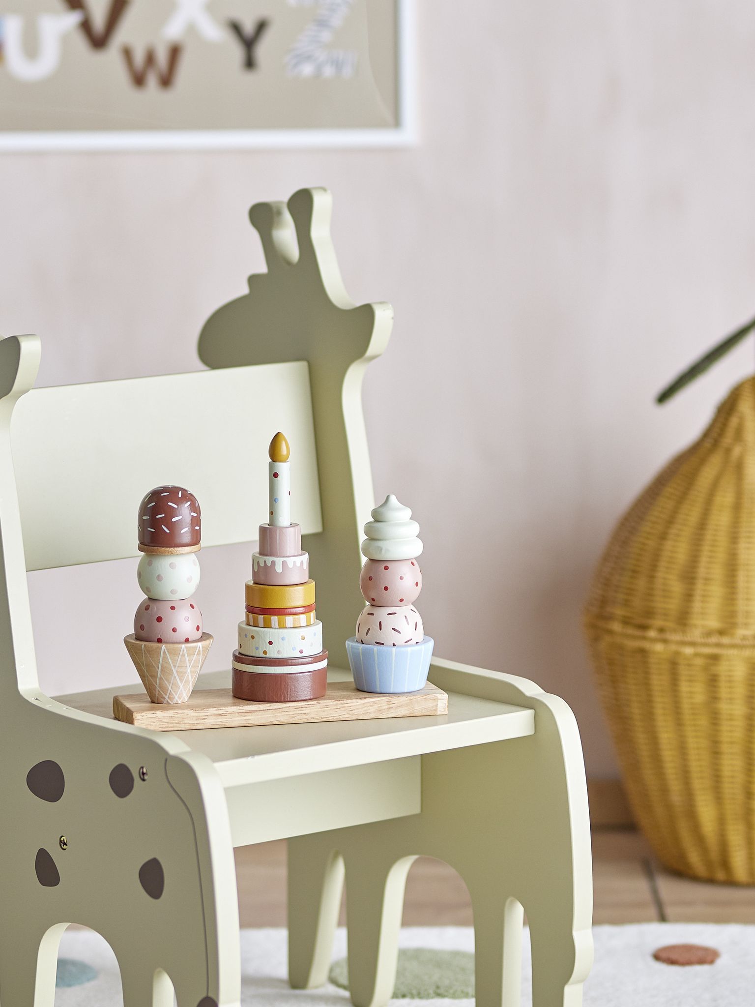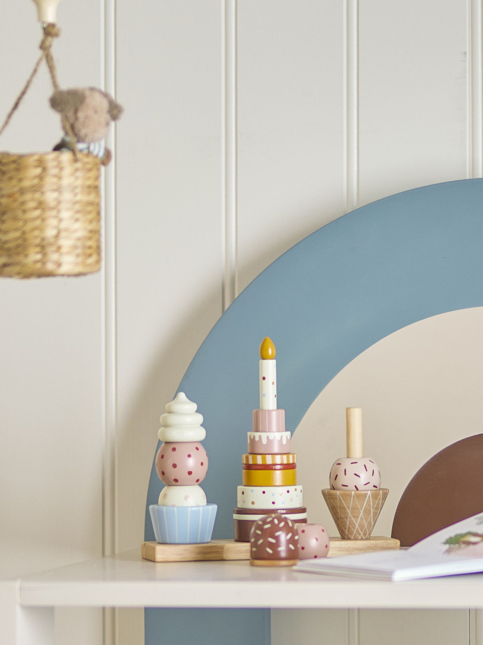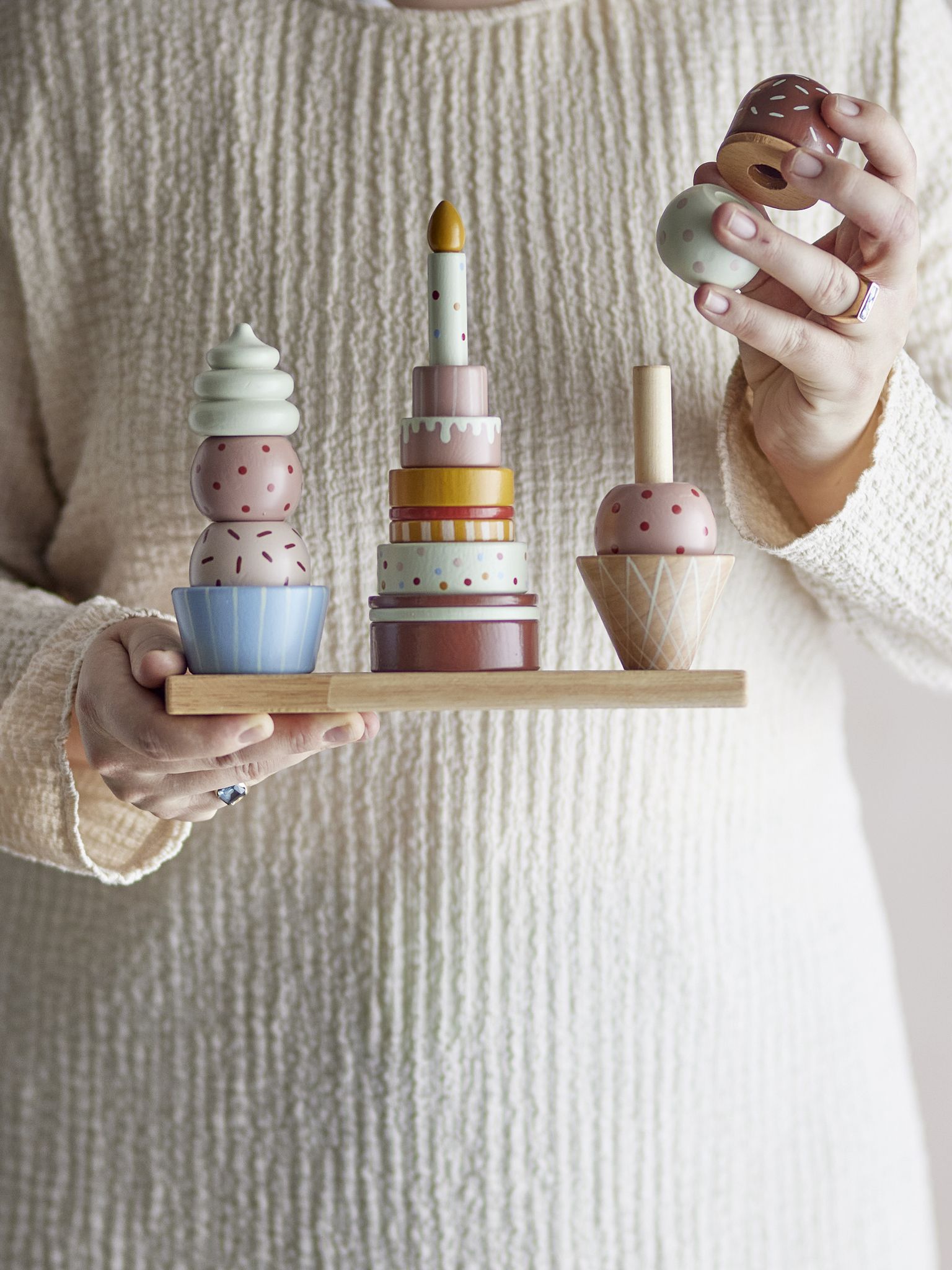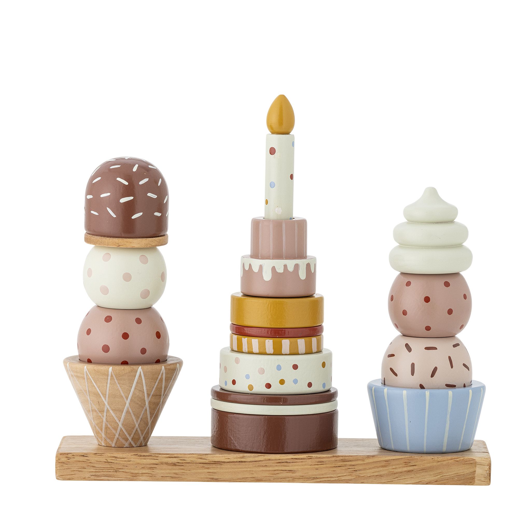Upptäck Bloomingville Celebrate Aktivitetsleksak, en festlig stapeltorn av hållbart bokträ, designad som födelsedagstårtor och glassar för barnrummet.