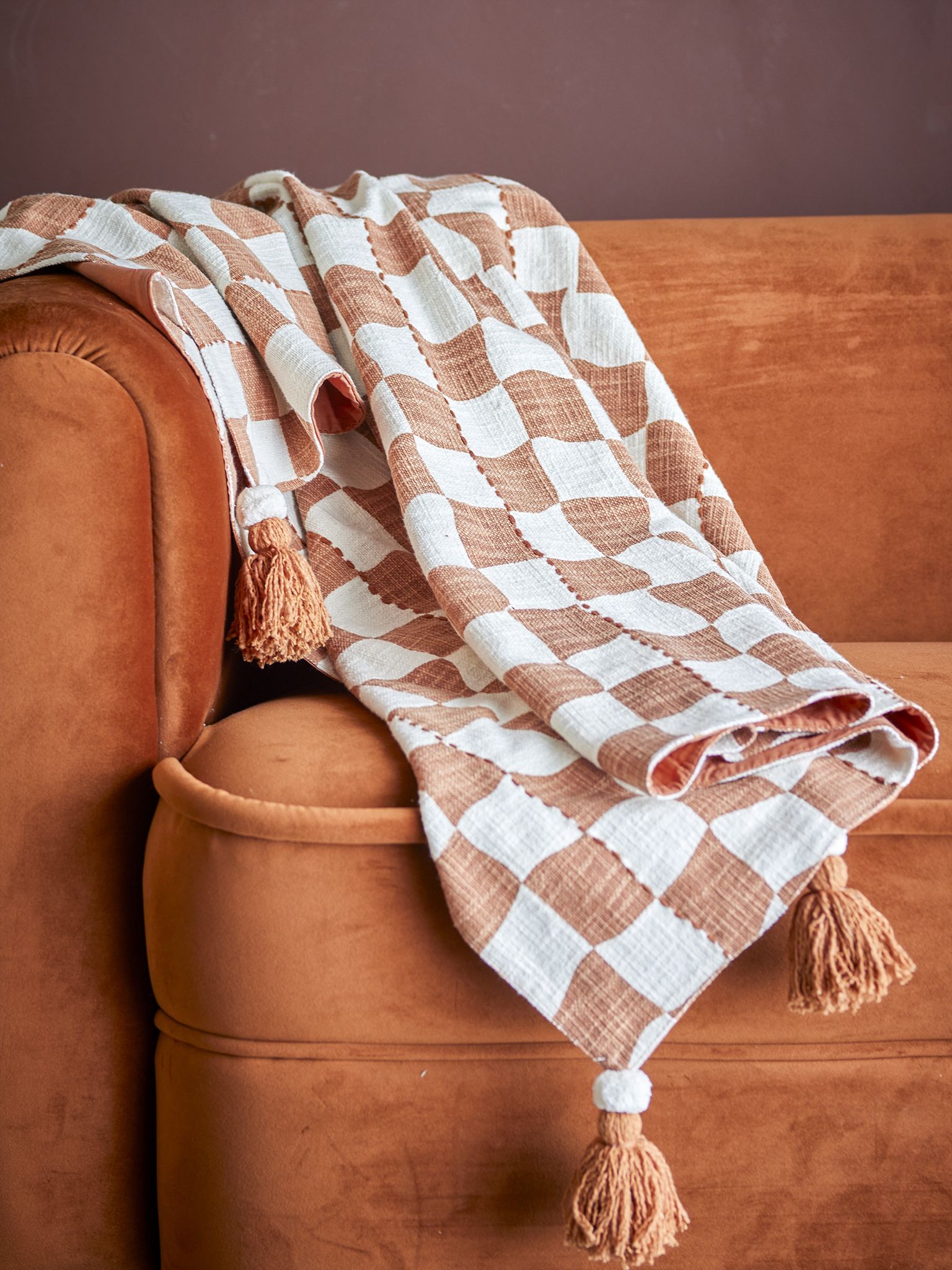 - Design: rutigt geometriskt mönster i brun/orange nyans med vit kontrast.