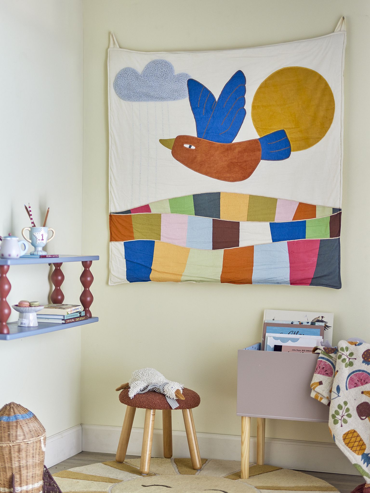 - Design: motiv med fågel i blå nyanser, sol i gult och moln; nederkanten pryds av färgglada patchwork-remsor.