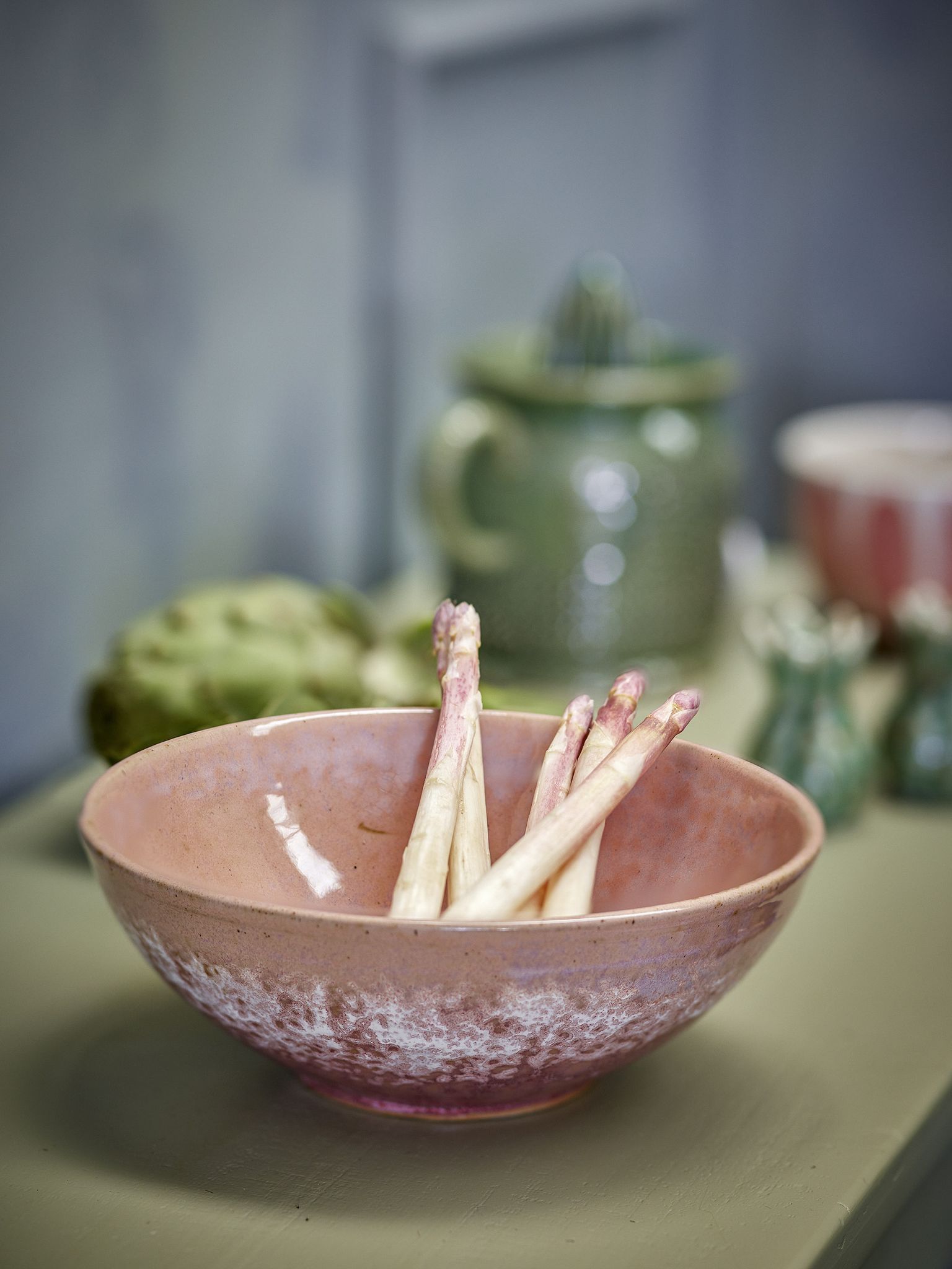 - Material och finish: stengods med glasyr i varm rosa nyans och vit speckbildning.