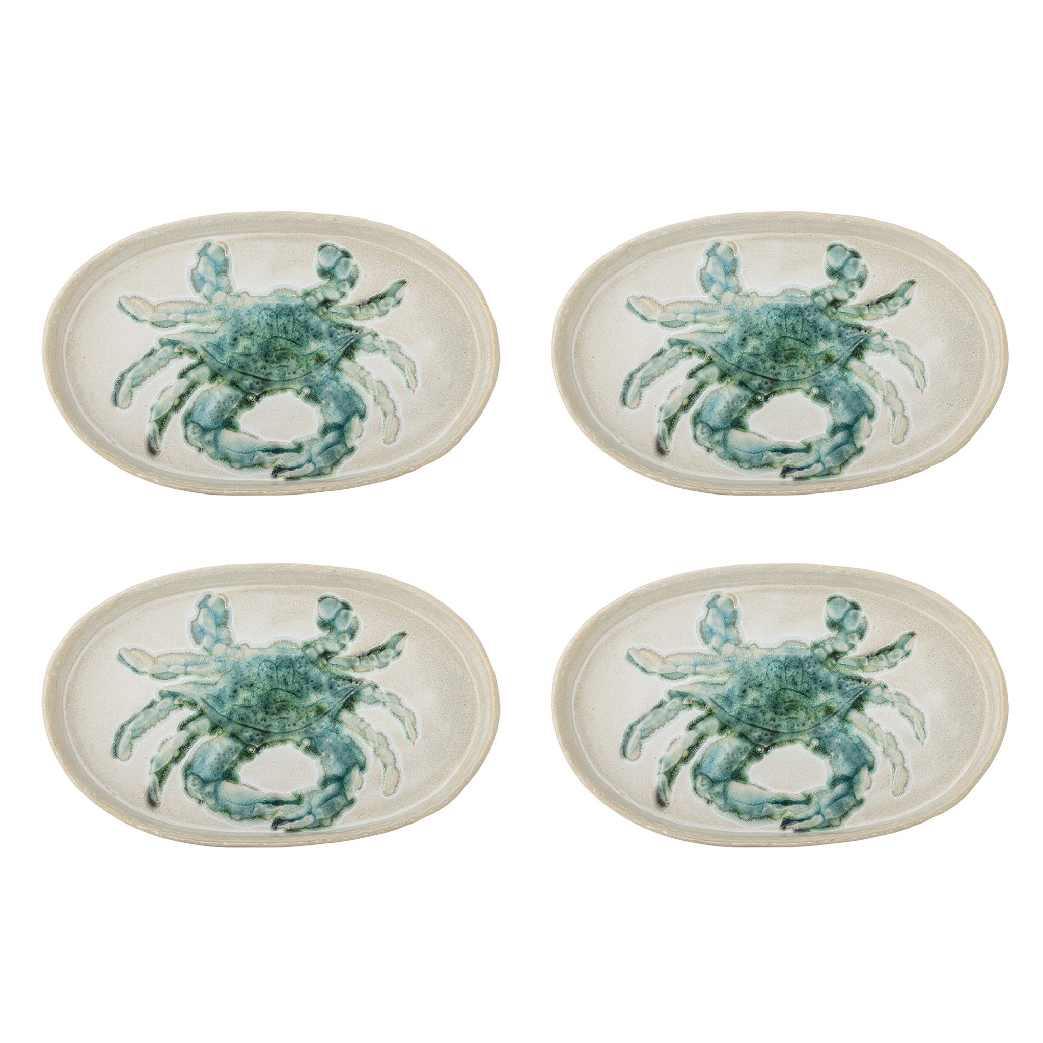 Hadden Tallrik Grön Stengods – Set om 4 från Bloomingville Creative är en färgklick till bordet med ett havsinspirerat kräftmönster i gröna nyanser. Den ovala formen och den krämiga glasyr ger en modern och tidlös känsla till varje måltid.