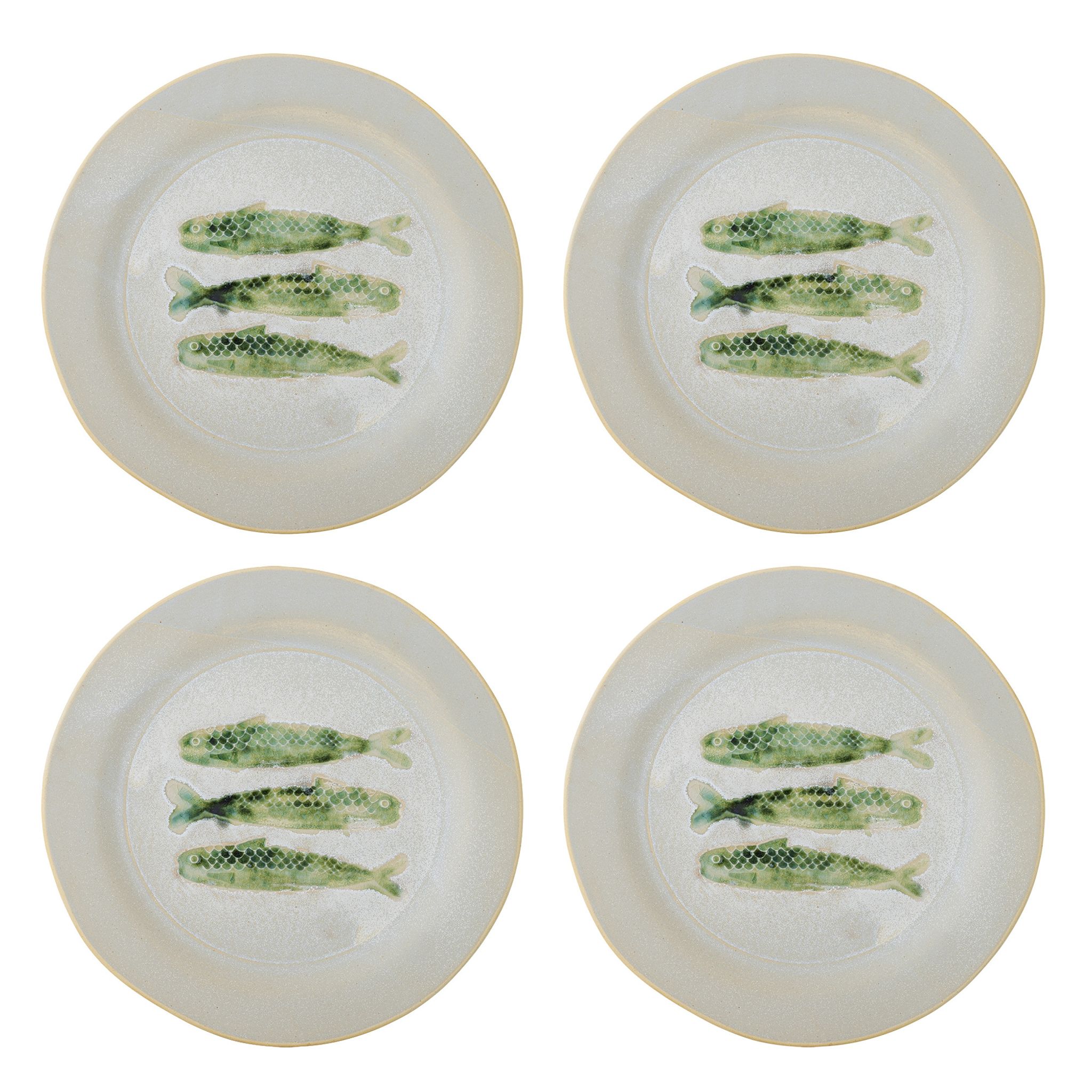 Hadden Tallrik Grön Stengods Ø27 cm Set om 4 Bloomingville Creative är en stilfull tallriksserie i gröna nyanser som lyfter bordet med ett lekfullt fiskemotiv. Tillverkad i stengods med glasyr, varje tallrik pryds av tre gröna fiskar och passar både till vardagsmåltiden och en festligare dukning.