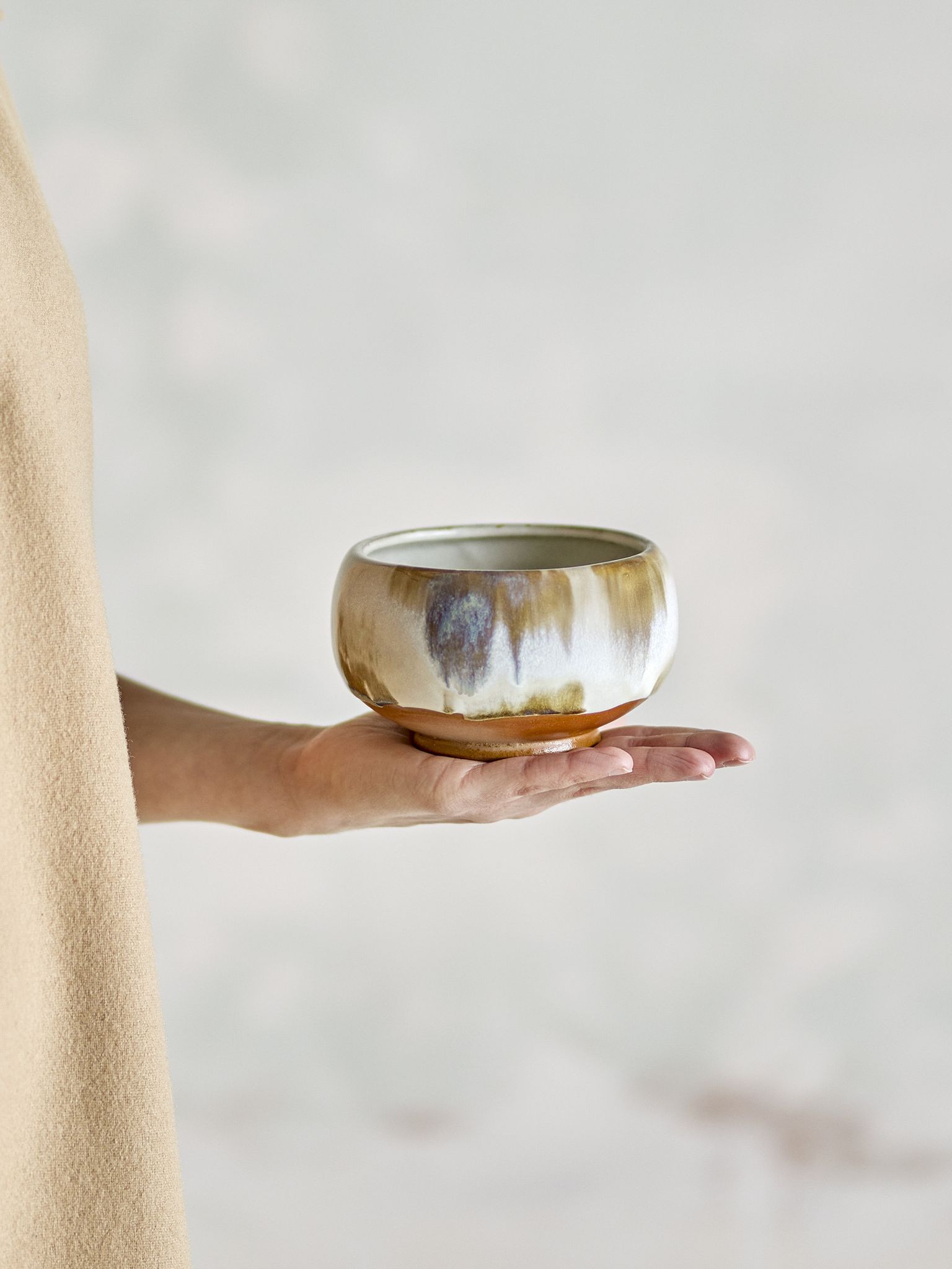- Design: naturfärgade creme-beige nyanser med mjuka övergångar och en oglaserad terrakottafot