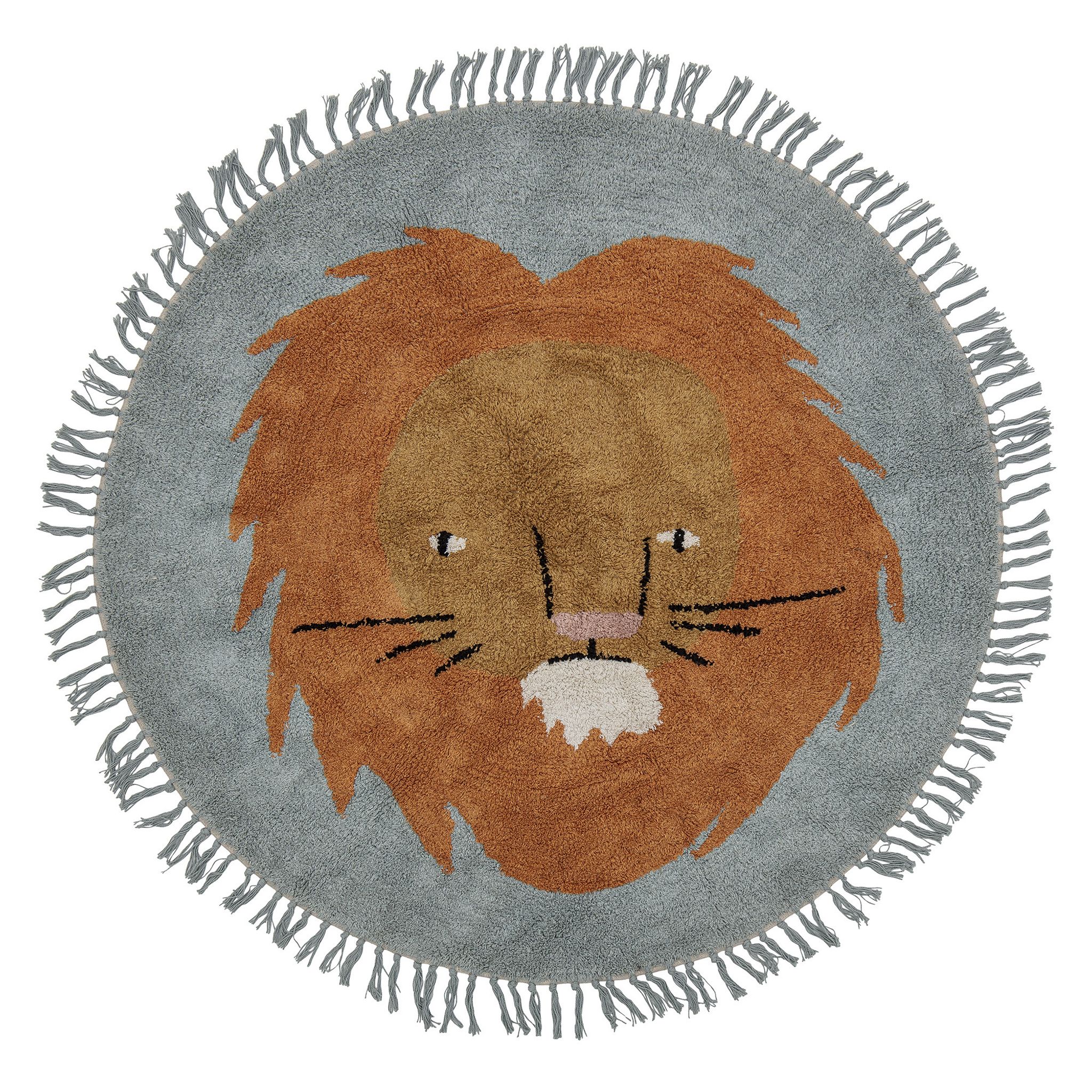 Leroy Matta Blå Ø130 cm från Bloomingville Mini är en lekfull bomullsmatta med lejonansikte, perfekt för barnrum eller vardagsrum.