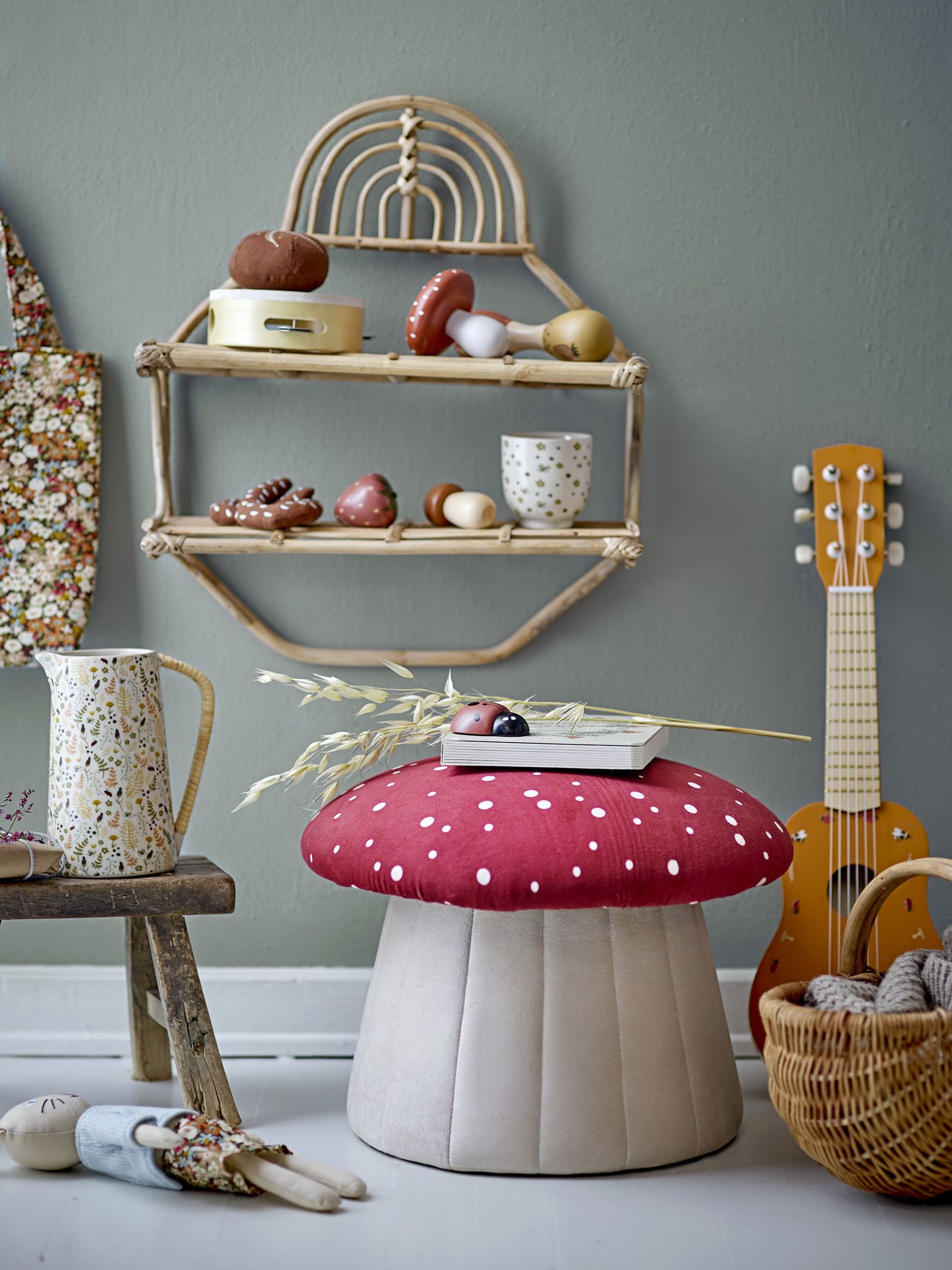 Lue Puff Röd MDF Ø37 cm från Bloomingville Mini är en lekfull pall med mjuk textil och stabil bas, perfekt som extra sittplats eller dekorativ accent.