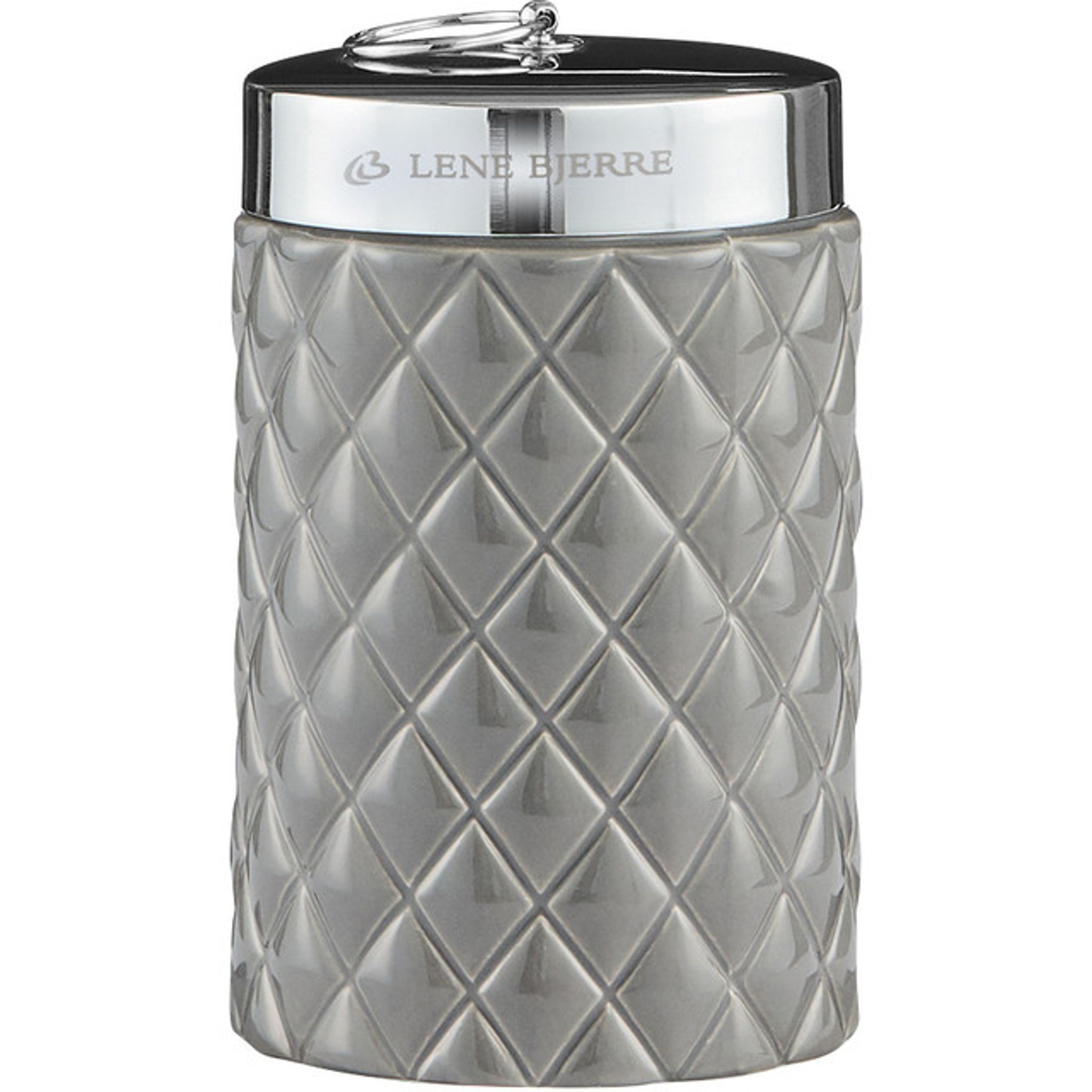 Upptäck Lene Bjerre Portia Förvaringsburk i en elegant mellangrå nyans med ett stilrent harlequin-mönster. Denna exklusiva burk mäter H14xØ9 cm och är perfekt för att förvara småsaker i badrummet, vilket gör den både praktisk och dekorativ.