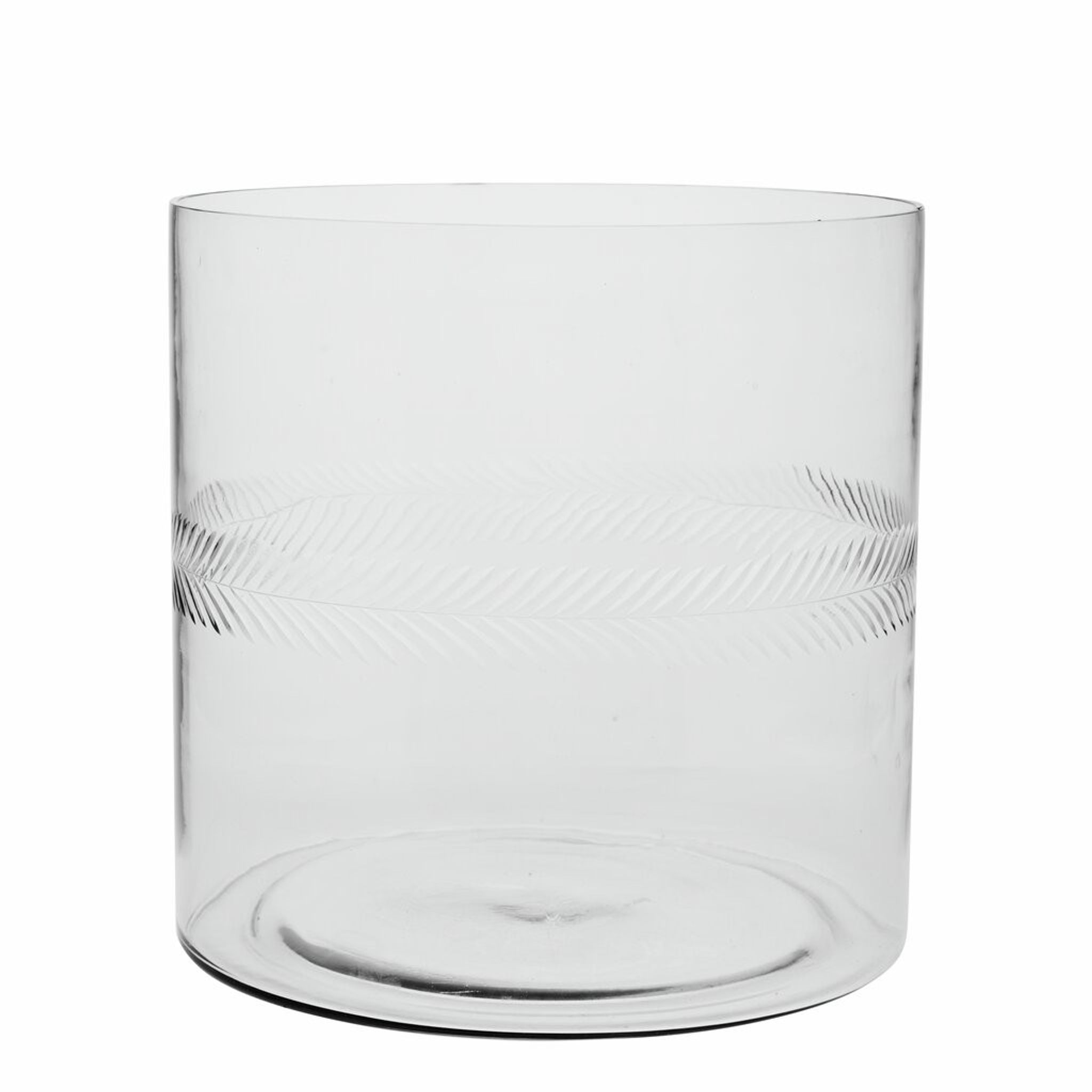 Vasen är i klarglas och har måtten L30xW30xH30 cm, vilket gör den användbar för både blomsterarrangemang och som ljushållare. Det etsade mönstret ger textur och låter ljuset spela genom glaset, samtidigt som materialet är hållbart för inomhusbruk.