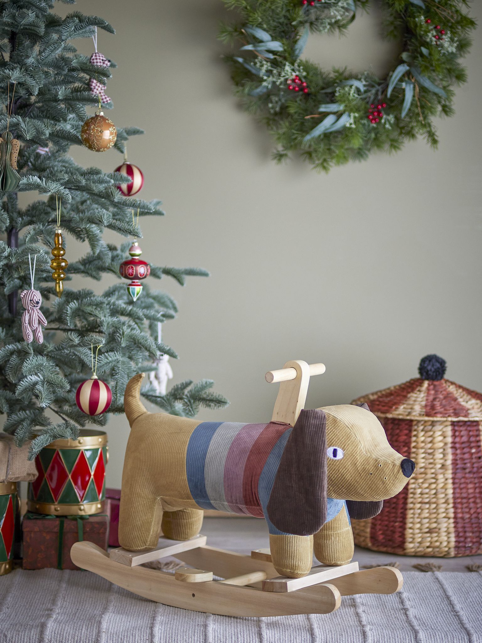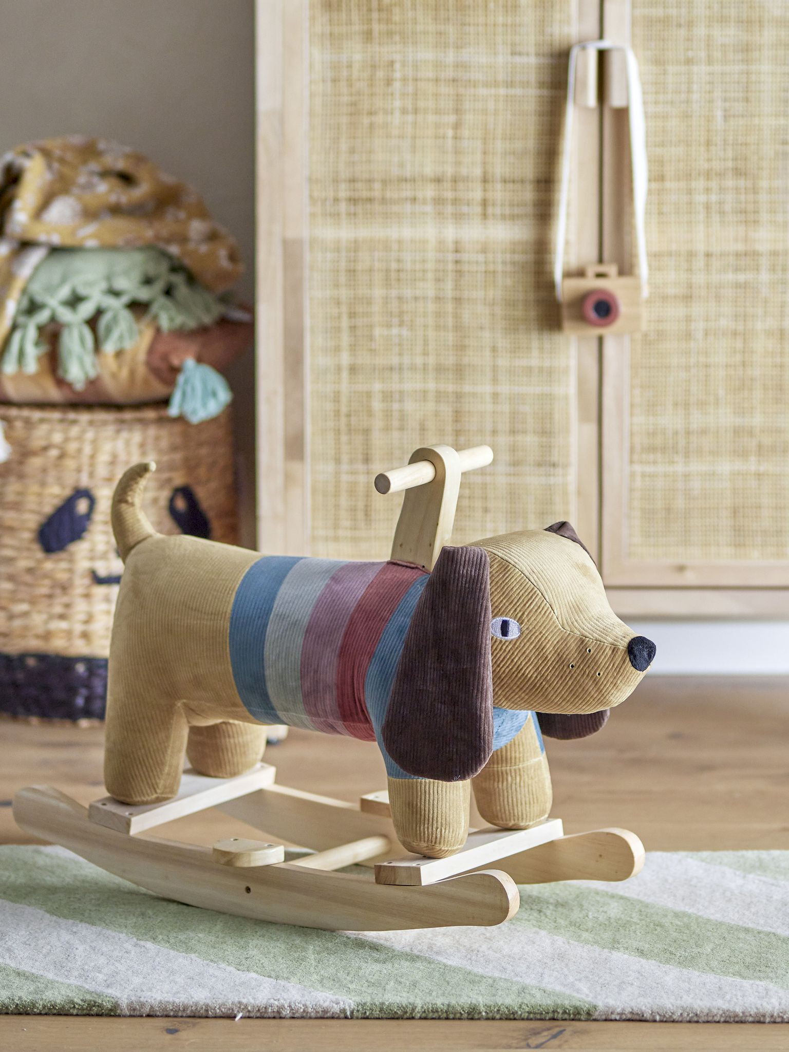 Charlie Gungleksak är en charmig hund i Bloomingville Mini, 75 cm lång. Klädd i brun polyester med färgglada randband. Den stabila konstruktionen består av en mjuk stoppning, poppelträram och järnbeslag som gör den tålig att gunga och leka på.