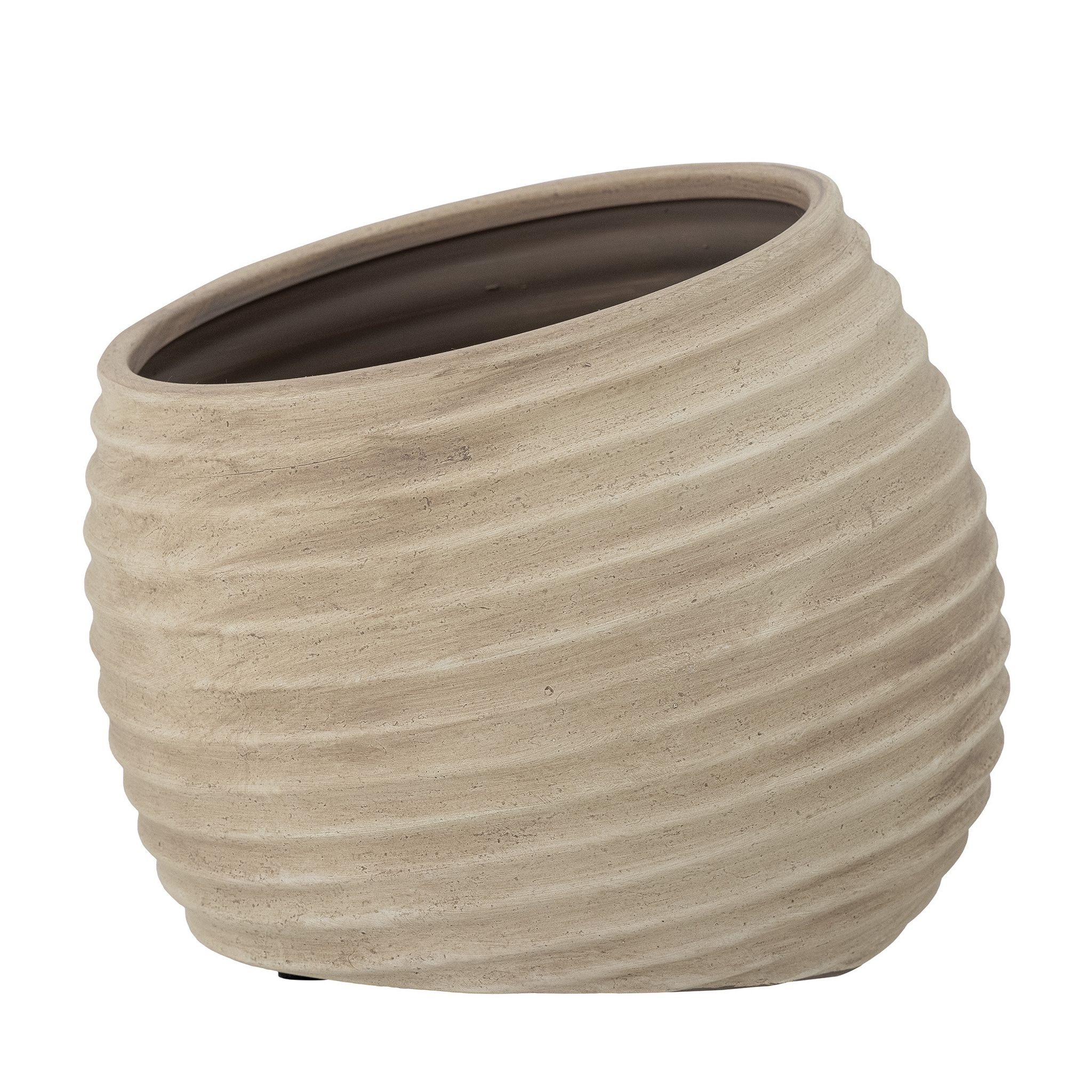 En handgjord terrakottakrukla med organisk form och horisontella, ljusbruna nyanser som ger din inredning en varm, inbjudande stämning. Den passar lika bra i vardagsrummet som på balkongen eller ute på altanen — ett enkelt sätt att visa upp dina växter och ge hemmet mer karaktär.