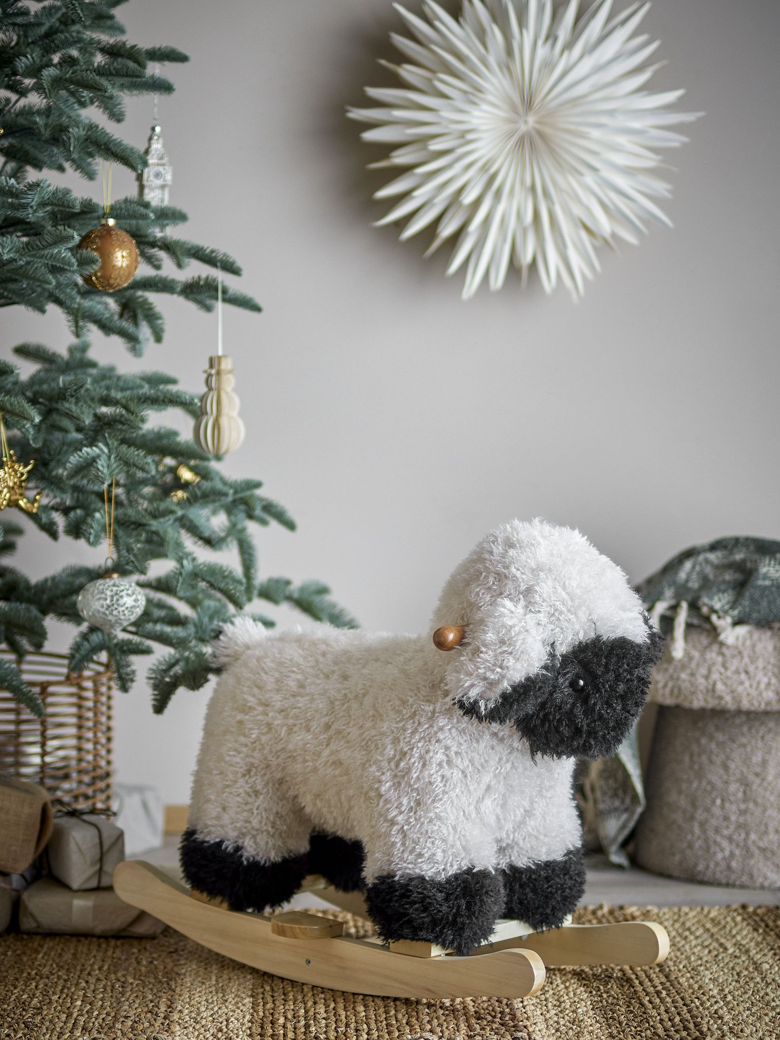 Dolly Gungleksak, får i vit polyester med svarta detaljer och träbas. Bloomingville Mini – mjuk, lekfull gungande följeslagare för barnrummet.