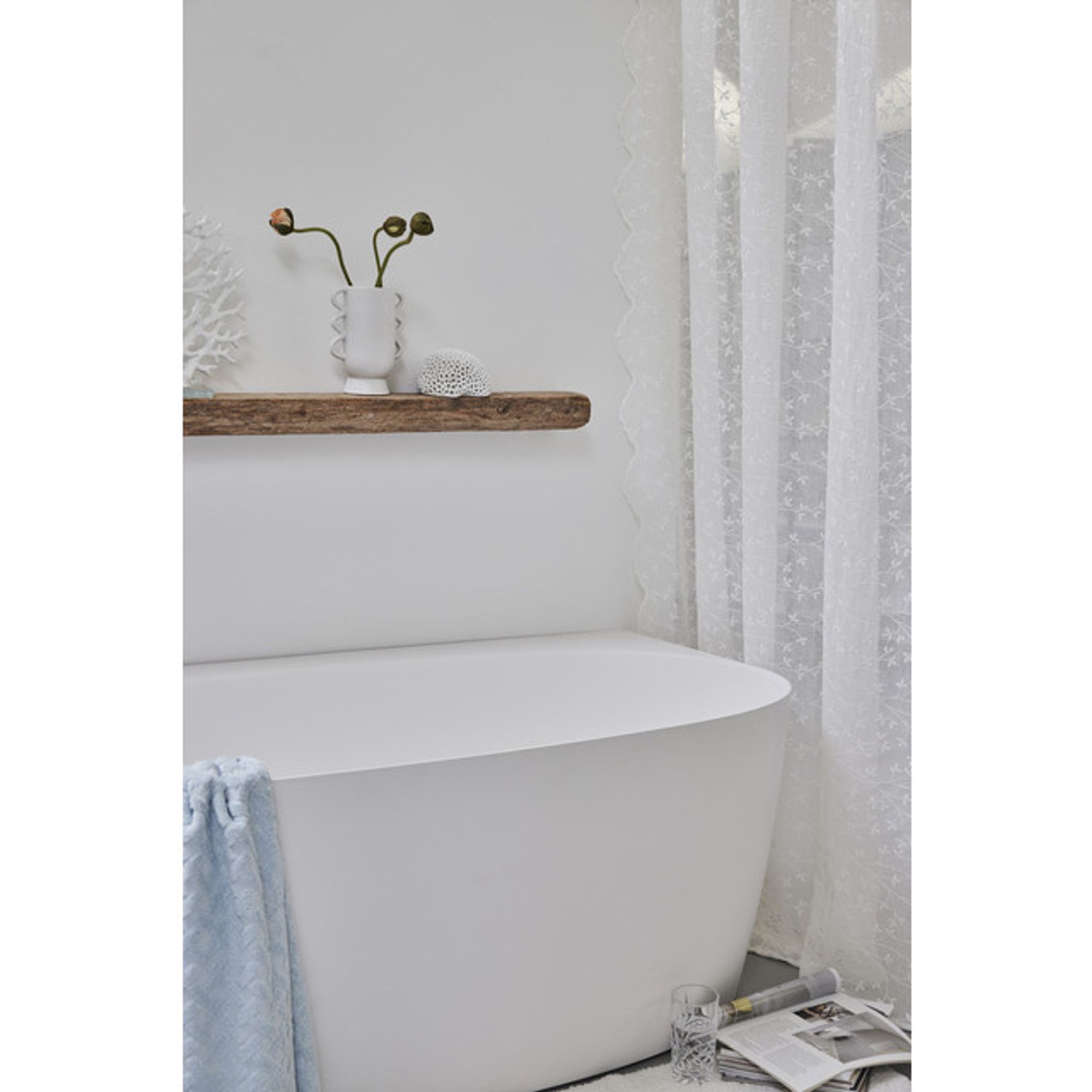 Eloise kombinerar funktion och design med sina broderade blommor — den förbättrar din vardag genom att hålla duschområdet snyggt och minska stänk på golvet. Den benvita färgen gör det enkelt att matcha med övriga badrumstextilier och skapar en lugn, ombonad känsla.