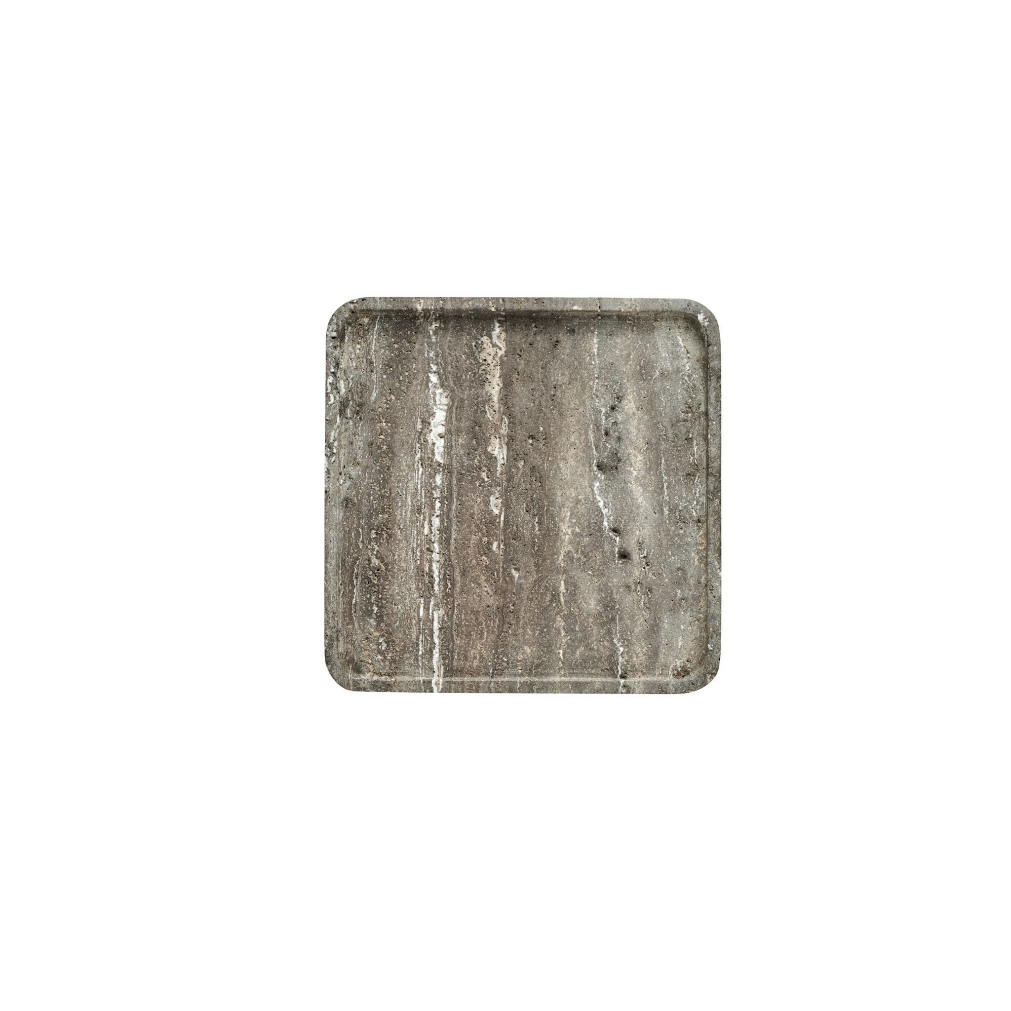 Brickan är tillverkad i travertin och har en varm brun ton med en slät yta och sval känsla. Måtten är L25 × B25 × H2 cm, en praktisk storlek för både dekoration och enklare servering.