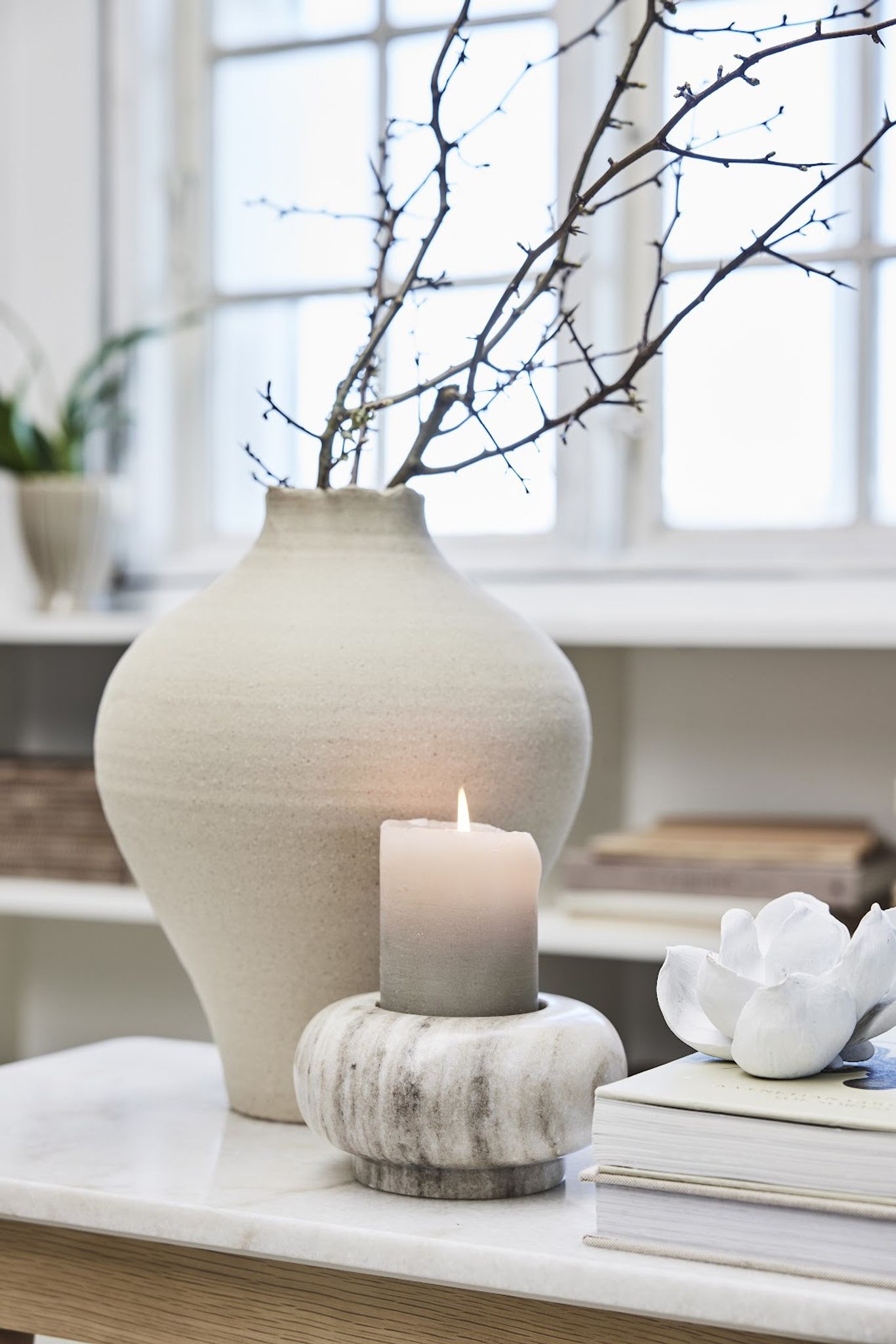Elina från Lene Bjerre är en ljusstake i marmor som fungerar som en stilren ljushållare för värmeljus. Den passar bra på soffbordet, fönsterkarmen eller i badrummet där du vill ha ett varmt sken och ett modernt, genomtänkt uttryck. Varje exemplar har unik ådring och färgvariation, så ingen är exakt lik den andra.