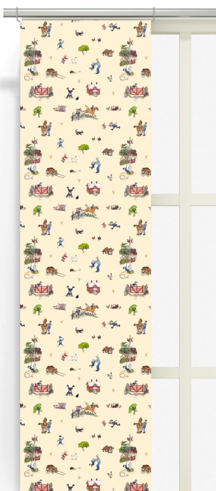 Emil I Katthult beige panellängd 2-pack från Arvidssons Textil – ett tygpanel med motivet Emil i Katthult av Astrid Lindgren. Beige bomullsdesign som tillför lantlig charm och fungerar som snyggt ljusreglerande fönsterpanel.