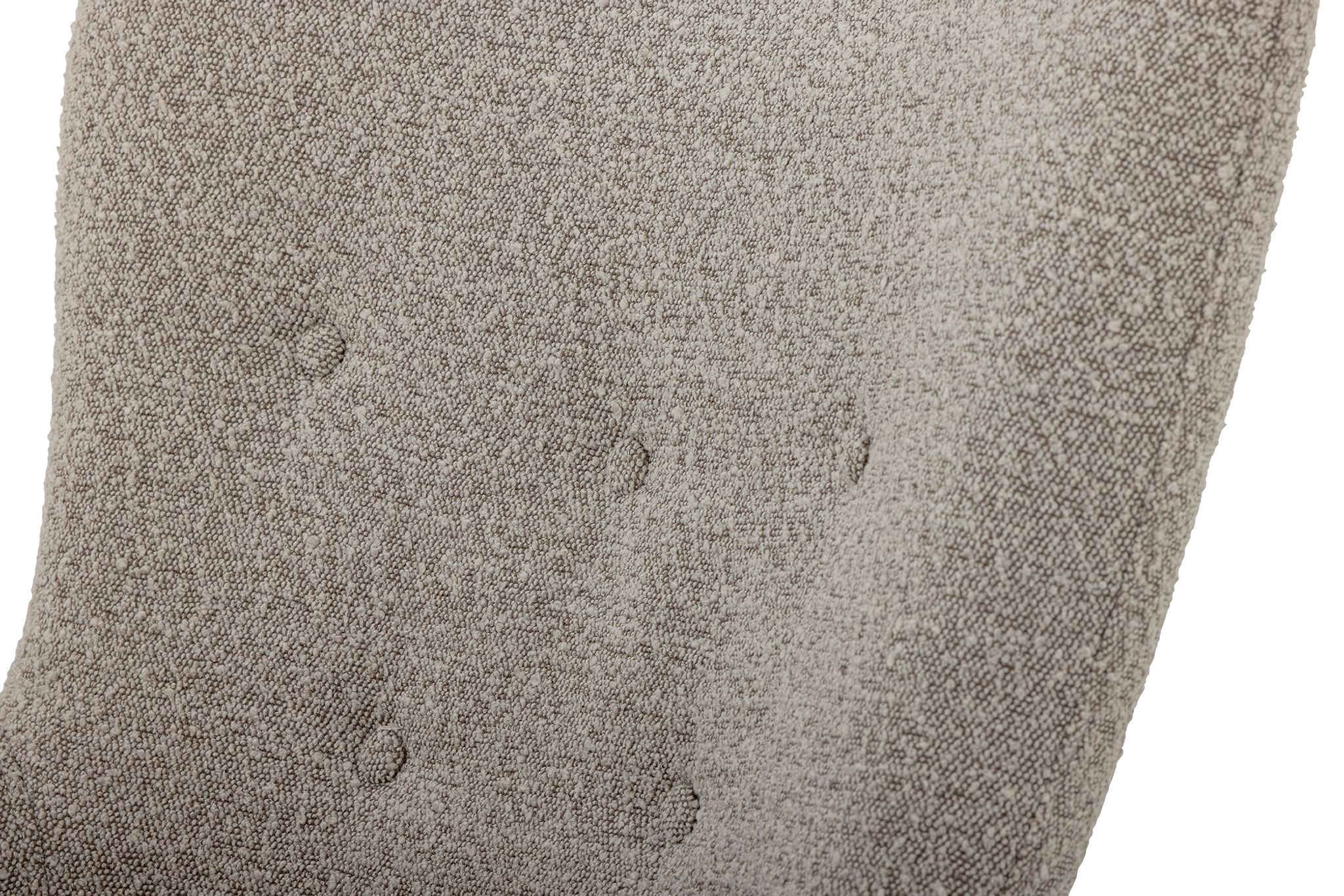 - Grå bouclé: Mjukt tyg som gör sittstunden skön och inbjudande.