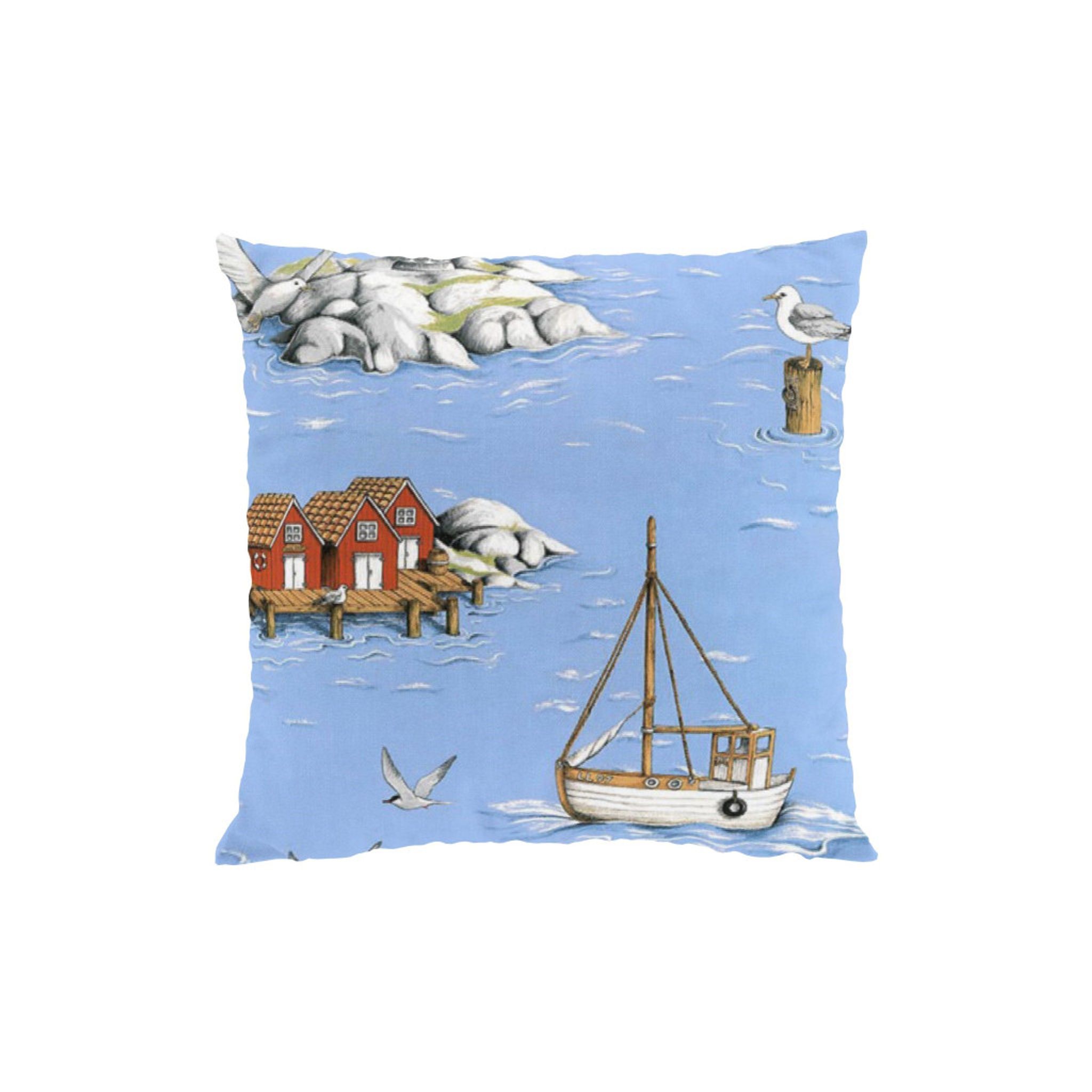 Ge ditt hem en maritim touch med Fiskeskär ljusblå kuddfodral från Arvidssons Textil. Detta vackra kuddfodral är prytt med en charmig illustration av röda stugor och segelbåtar, vilket skapar en lugn och inbjudande atmosfär.