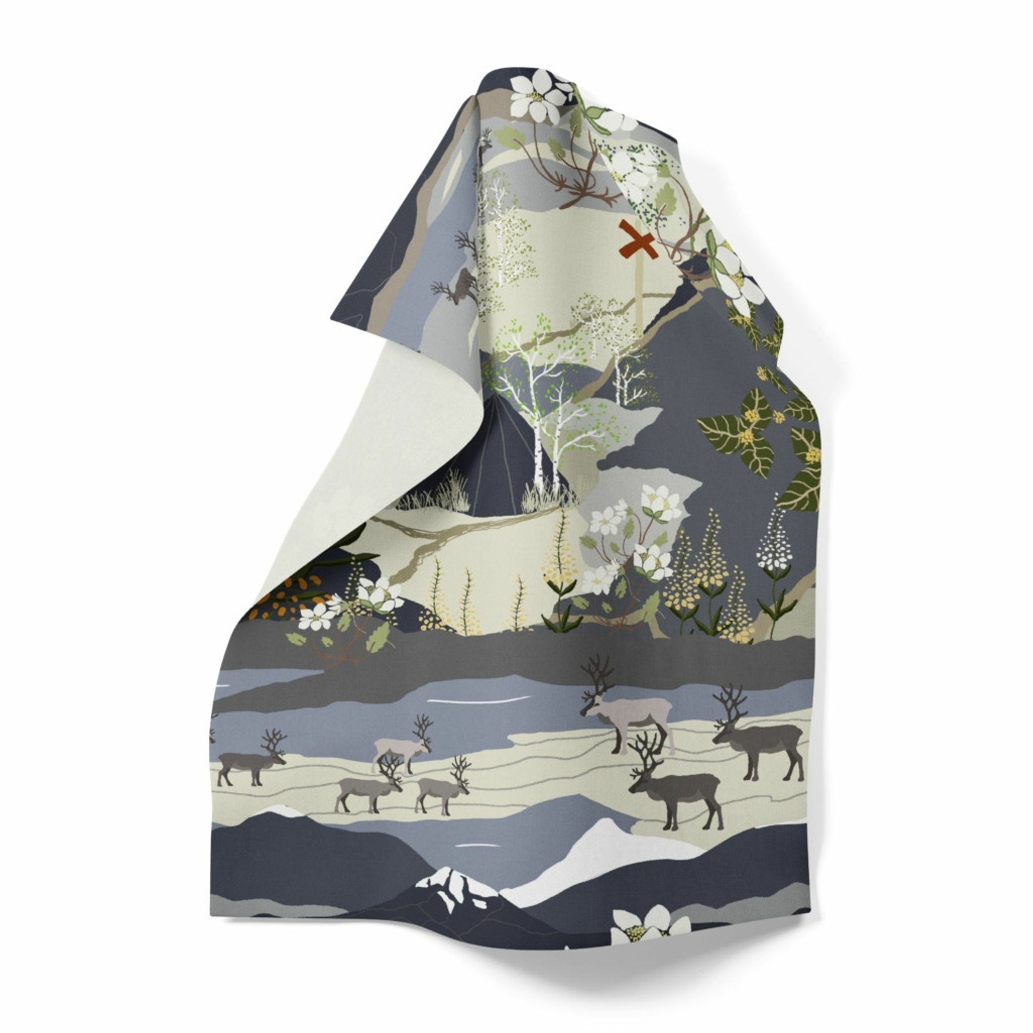 Upptäck den vackra handduken "Fjällvandring" från Arvidssons Textil, som fångar den magiska stämningen av fjällens skönhet. Med ett unikt mönster av renar, fjäll och porlande bäckar, ger denna handduk en konstnärlig touch till ditt hem.