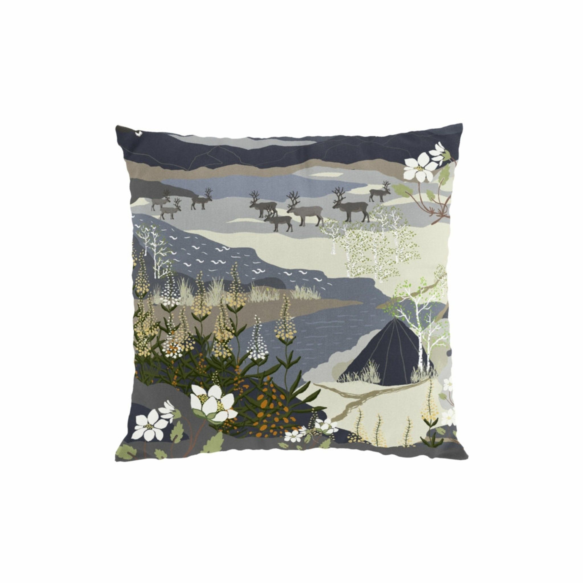 Upplev den magiska stämningen av fjällvandring med vårt blå kuddfodral "Fjällvandring" från Arvidssons Textil. Detta vackra kuddfodral fångar naturens skönhet med en konstnärlig design som inkluderar renar, fjäll och porlande bäckar.