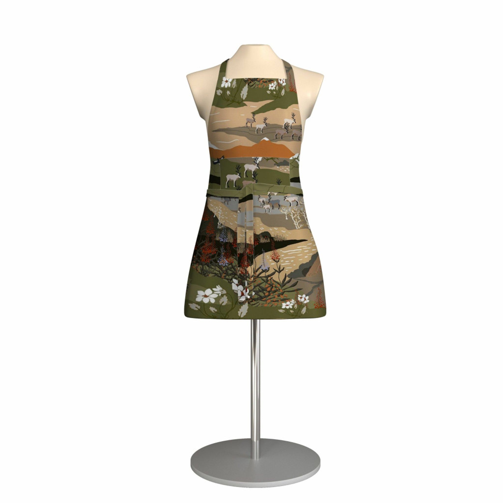 Upplev den magiska stämningen av fjällvandring med vårt gröna och beige förkläde från Arvidssons Textil. Det vackra tyget, "Fjällvandring med Renar, Fjäll och Porlande Bäckar", fångar naturens skönhet med en konstnärlig touch.