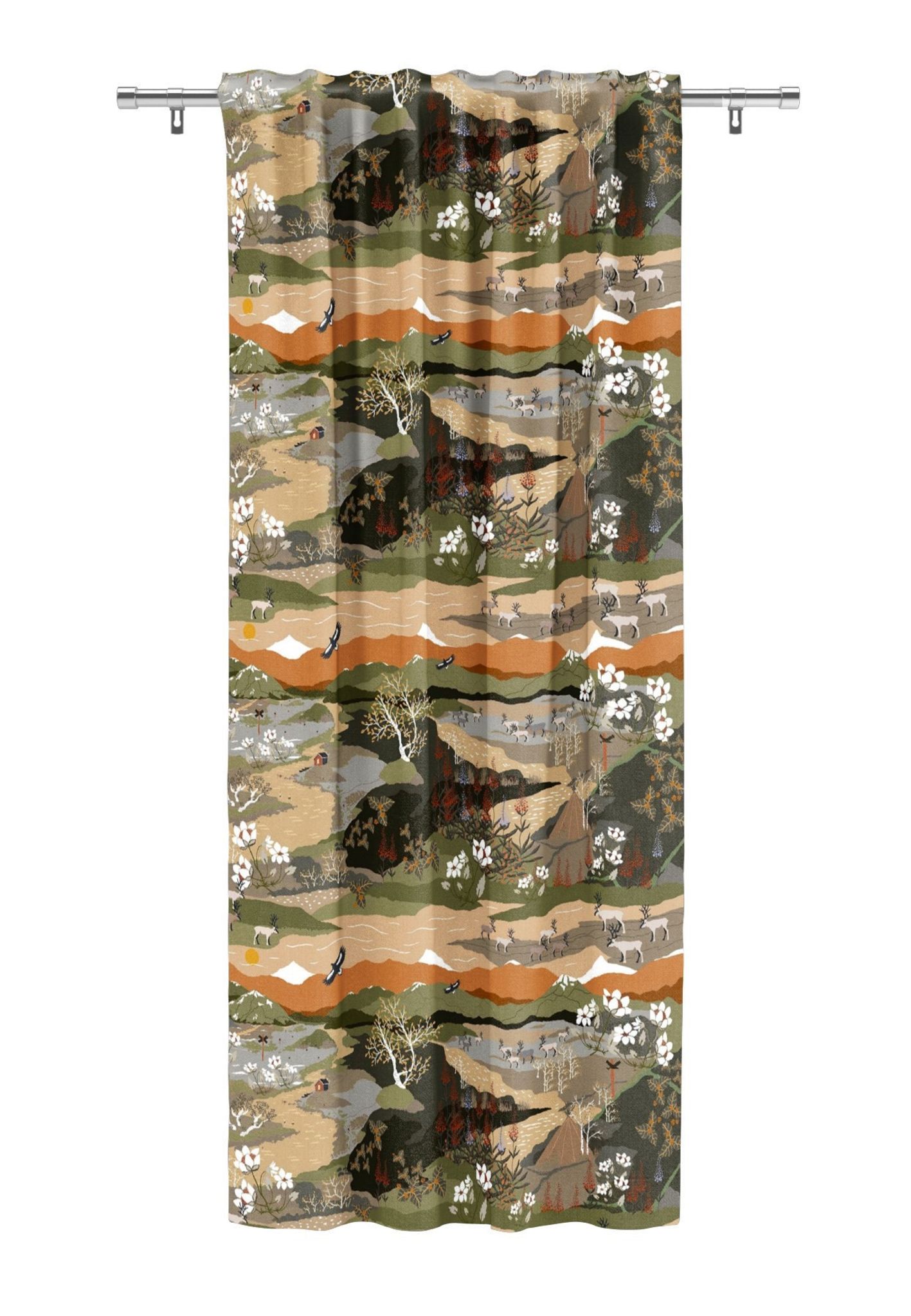 Upplev den norrländska naturens skönhet med vår Fjällvandring grön/beige multibandslängd från Arvidssons Textil. Detta unika mönster, designat av Louise Videlyck, fångar essensen av fjällen med motiv av renar, porlande bäckar och vackra vandringsleder.
