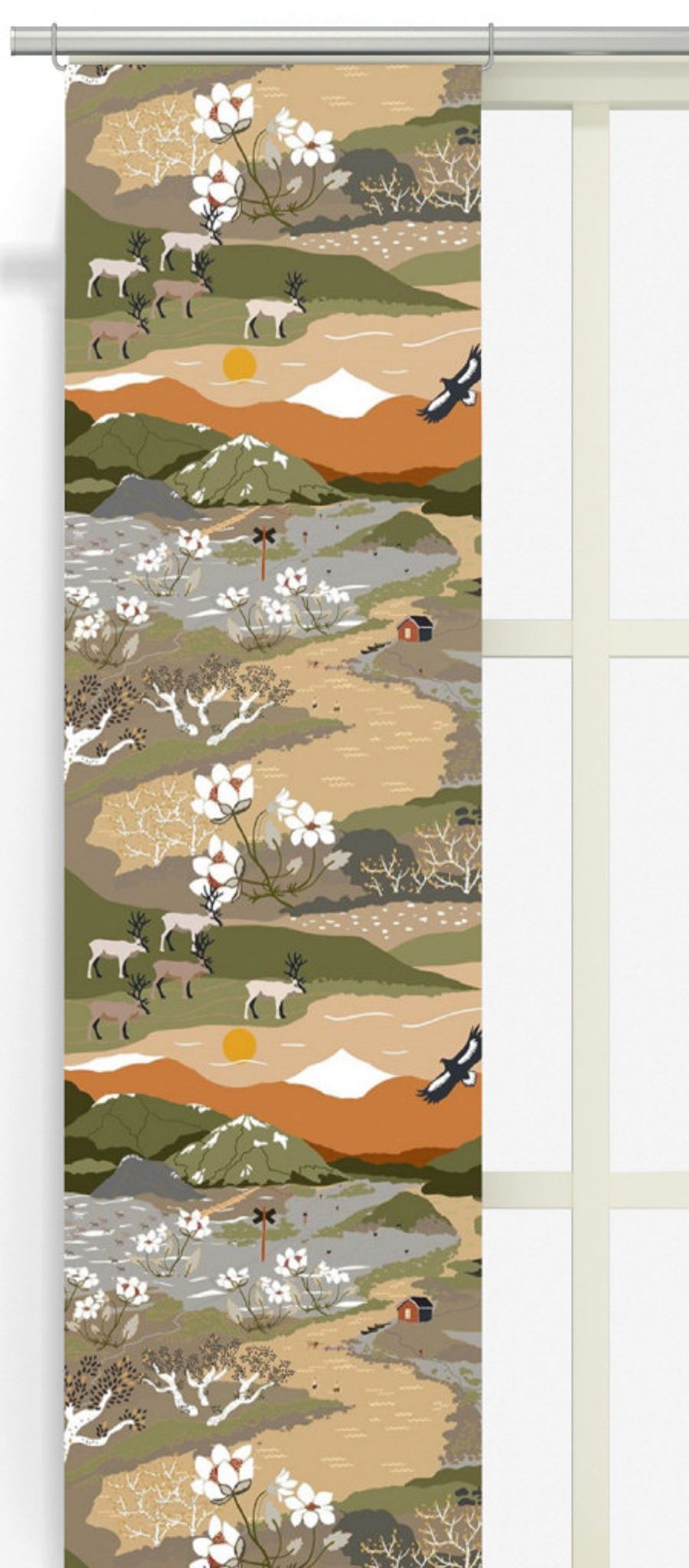 Upplev den magiska stämningen av fjällvandring med vår panellängd "Fjällvandring grön/beige" från Arvidssons Textil. Detta vackra tyg fångar naturens skönhet med detaljerade avbildningar av renar, fjäll och porlande bäckar.