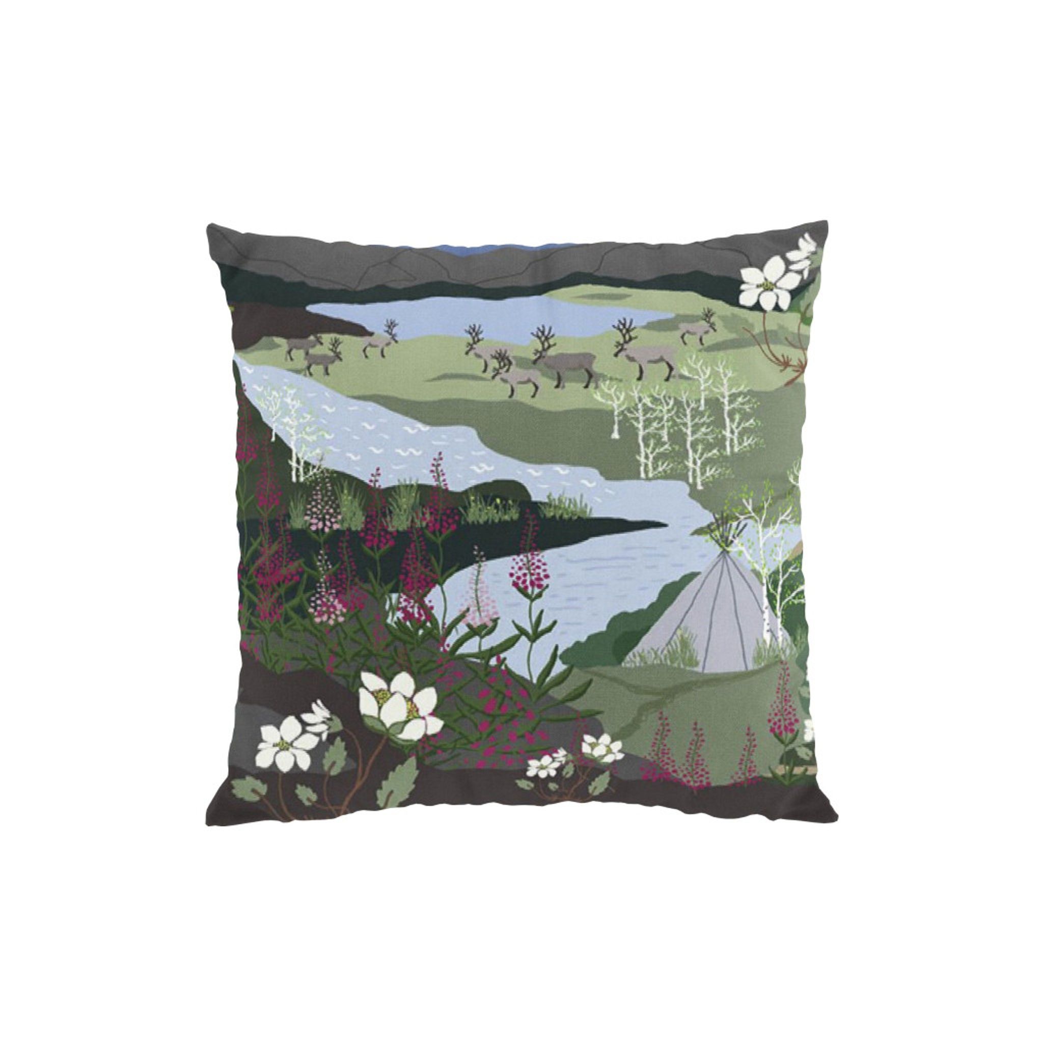 Upplev den magiska stämningen av fjällvandring med vårt kuddfodral "Fjällvandring" från Arvidssons Textil. Detta vackra fodral fångar naturens skönhet med en konstnärlig design som inkluderar renar, fjäll och porlande bäckar.