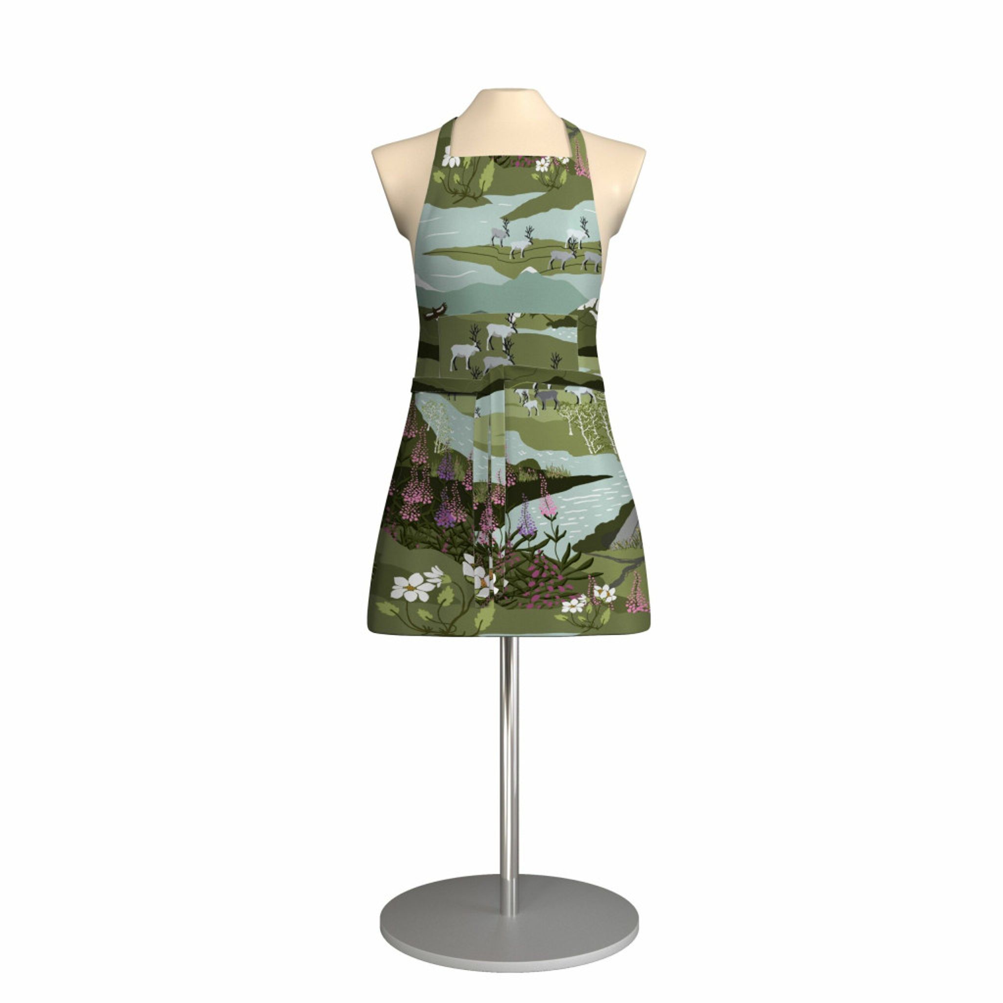 Upplev den magiska stämningen av fjällvandring med vårt förkläde i grön/turkos från Arvidssons Textil. Det vackra tyget, "Fjällvandring med Renar, Fjäll och Porlande Bäckar", fångar naturens skönhet med en konstnärlig touch.