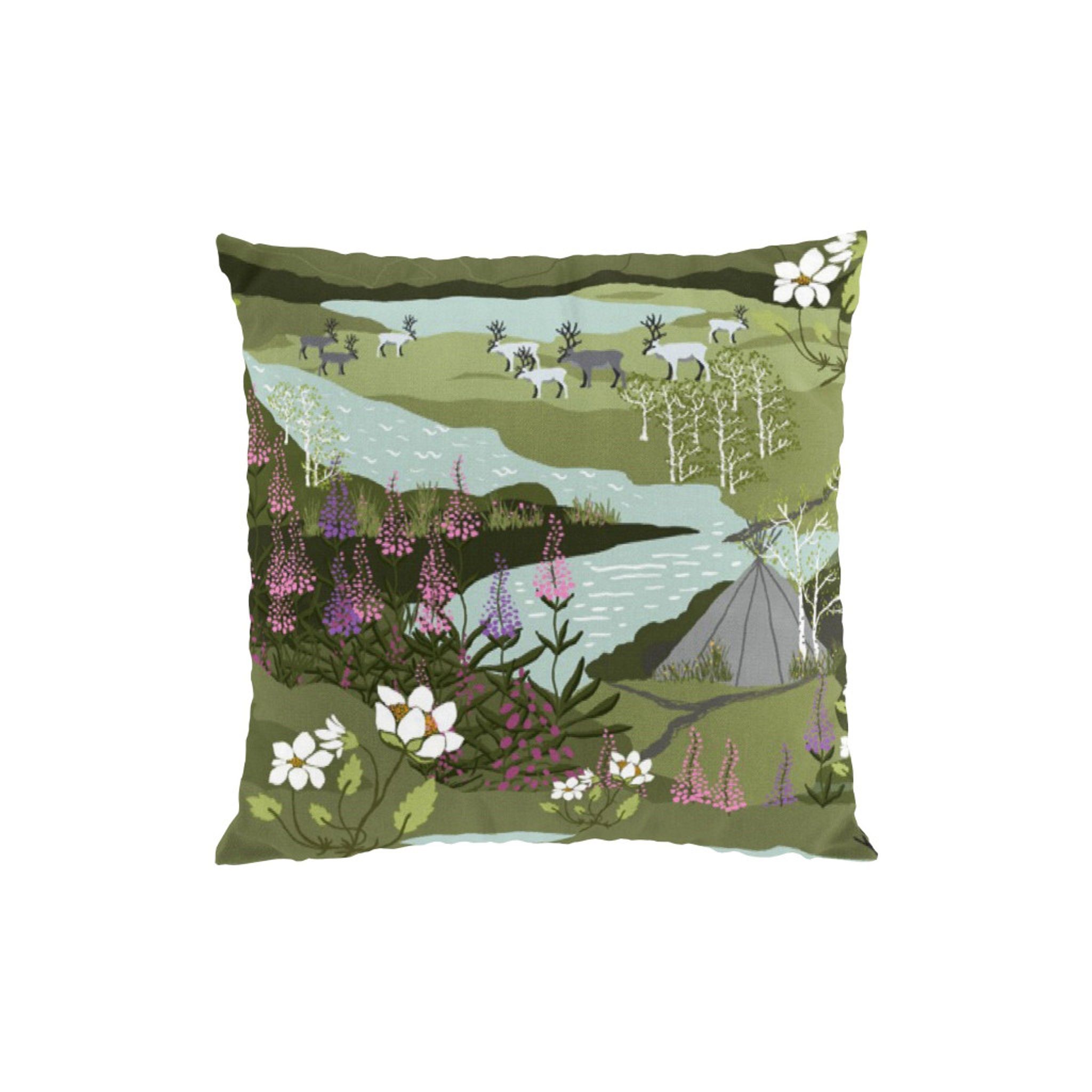 Upplev den magiska stämningen av fjällvandring med vårt kuddfodral "Fjällvandring grön/turkos" från Arvidssons Textil. Detta vackra tyget fångar naturens skönhet med detaljerade avbildningar av renar, fjäll och porlande bäckar.