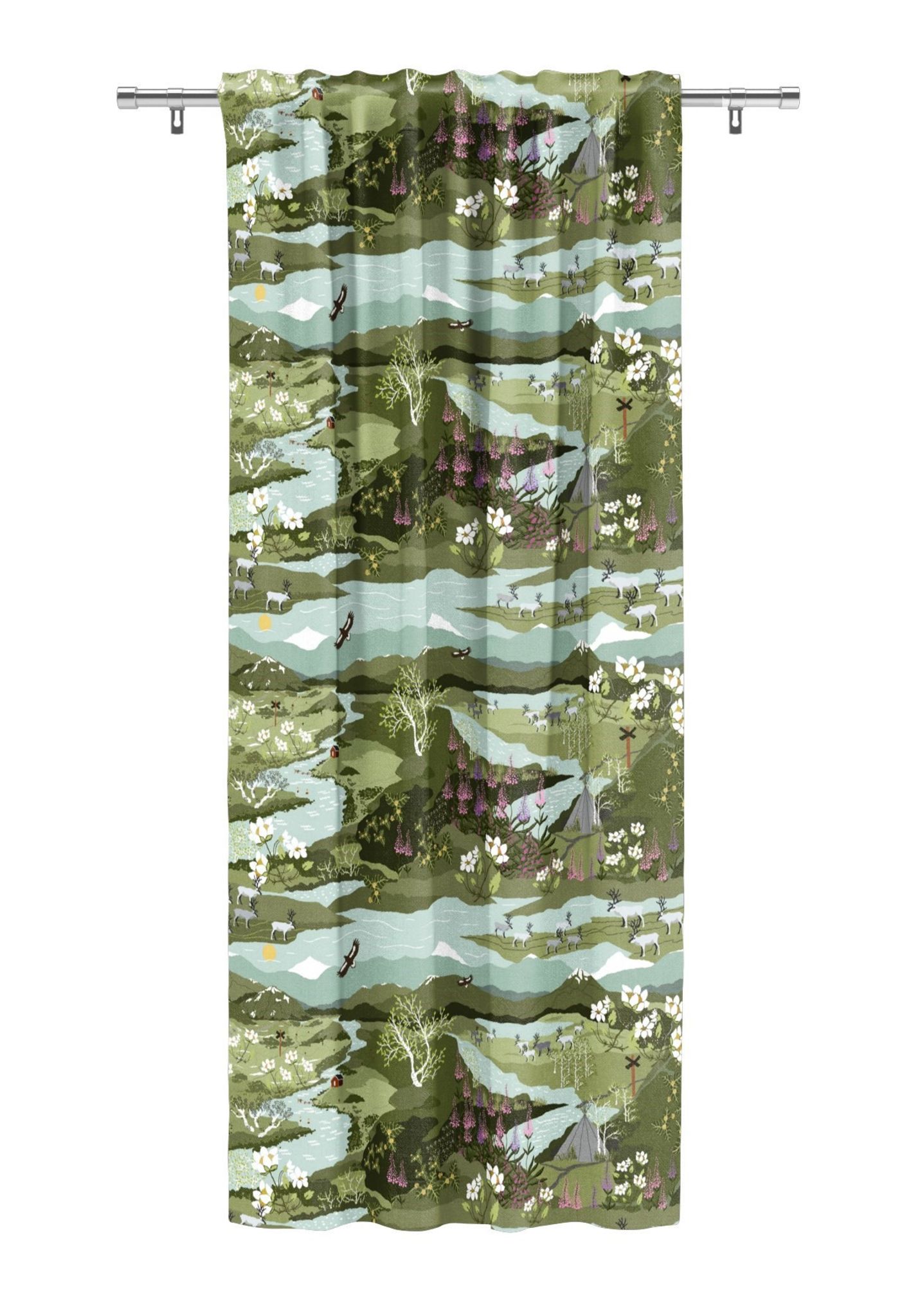 Upplev den norrländska naturens skönhet med Fjällvandring grön/turkos multibandslängd från Arvidssons Textil. Detta unika mönster, designat av Louise Videlyck, fångar essensen av fjällen med sina detaljerade illustrationer av renar, porlande bäckar och vackra vandringsleder.
