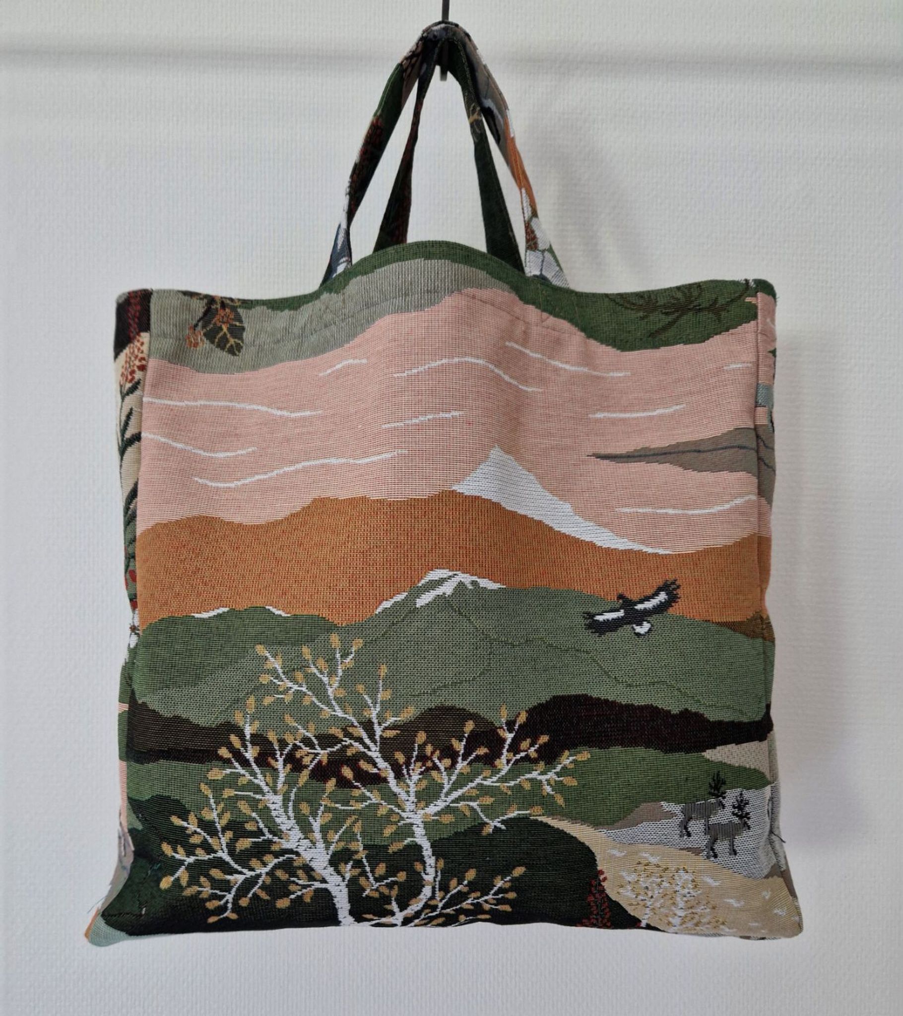 Fjällvandring jacquard grön/beige kasse från Arvidssons Textil är en stilfull och praktisk accessoar i jacquardväv. Tyget bär motivet Fjällvandring med Renar, Fjäll och Porlande Bäckar – en naturnära design som för med sig stämning och harmoni.