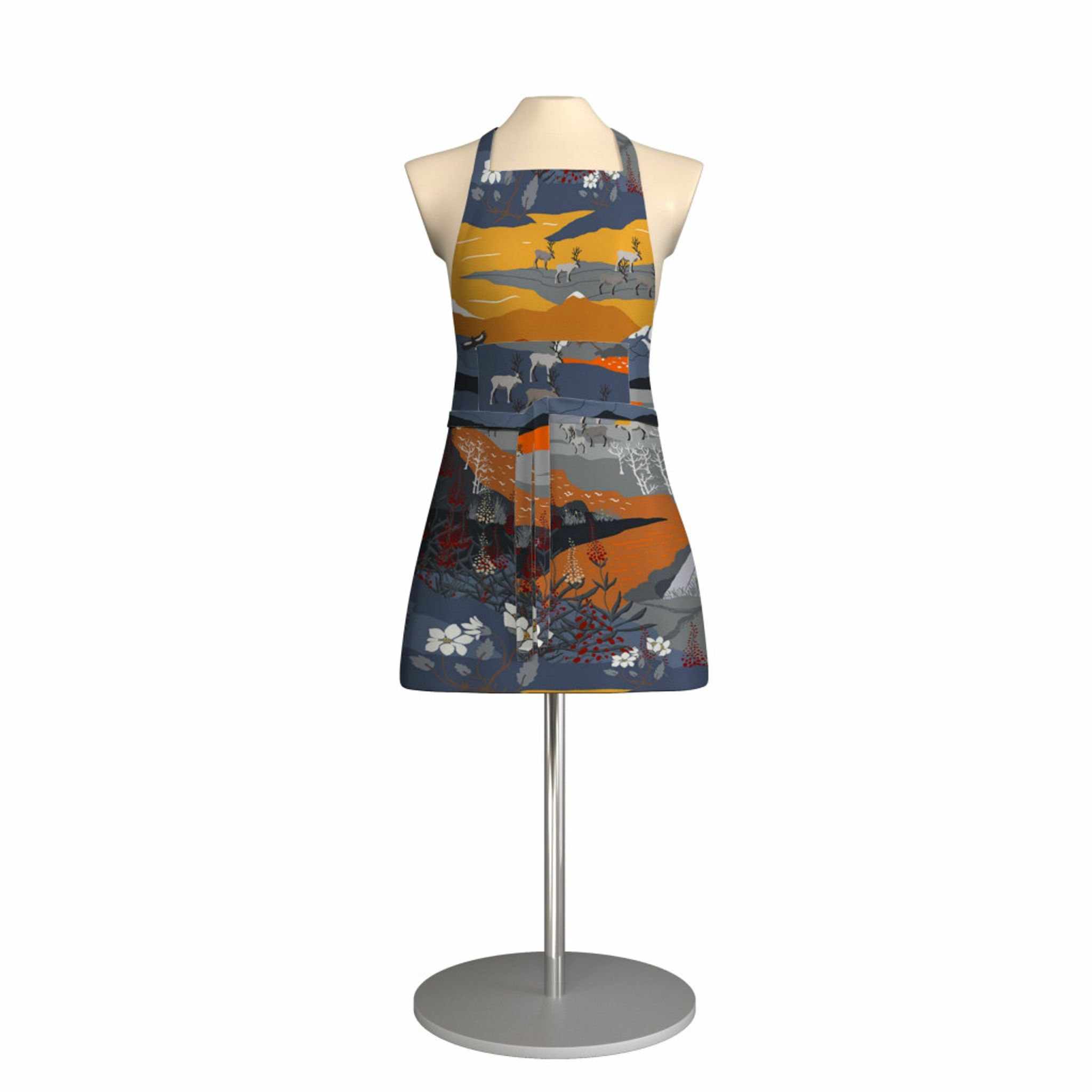Upplev den magiska stämningen av fjällvandring med vårt orange förkläde från Arvidssons Textil. Det vackra tyget, "Fjällvandring med Renar, Fjäll och Porlande Bäckar", fångar naturens skönhet med en konstnärlig touch.