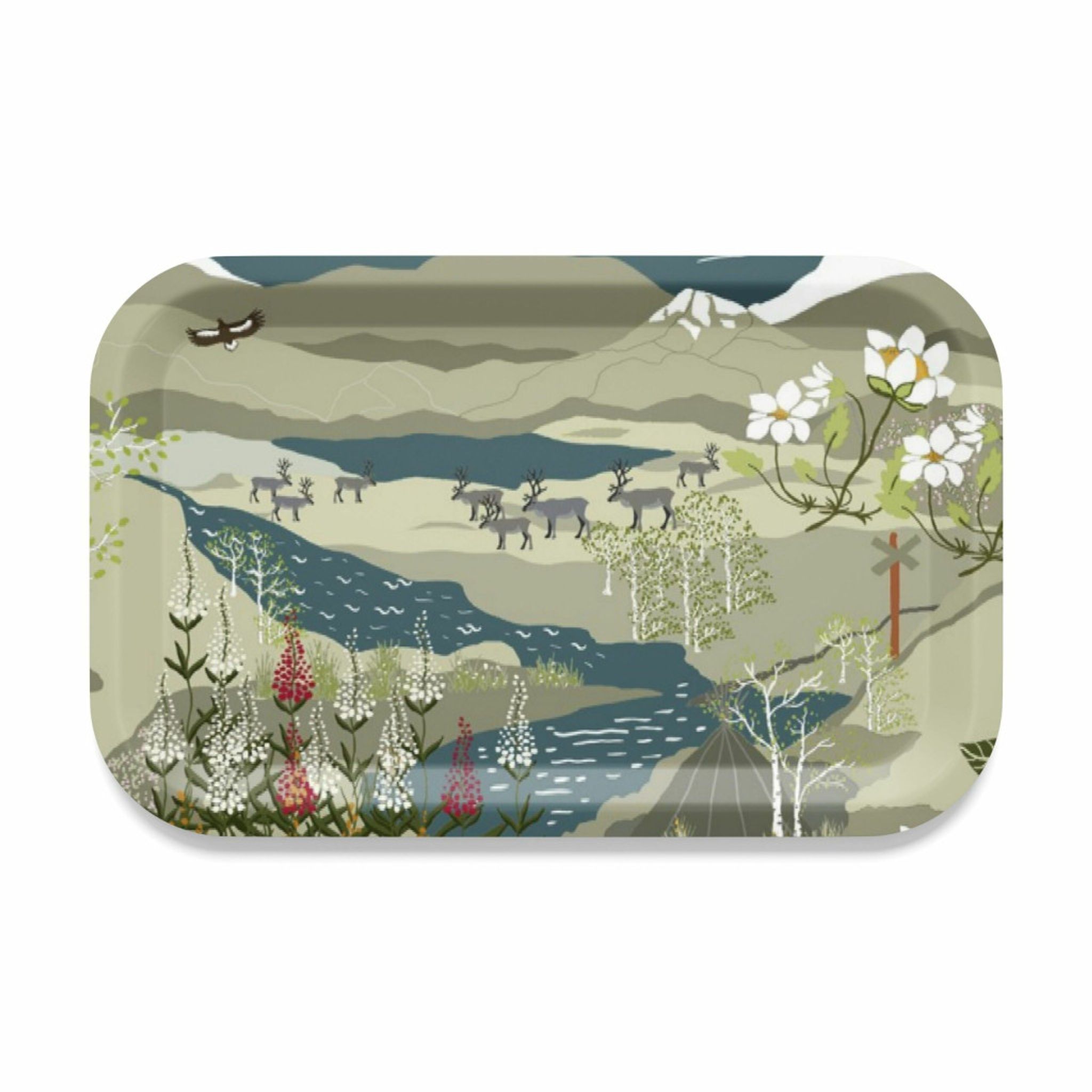 Med sin konstnärliga tolkning av en fjällvandring, ger denna bricka en känsla av harmoni mellan människa och natur. Låt den