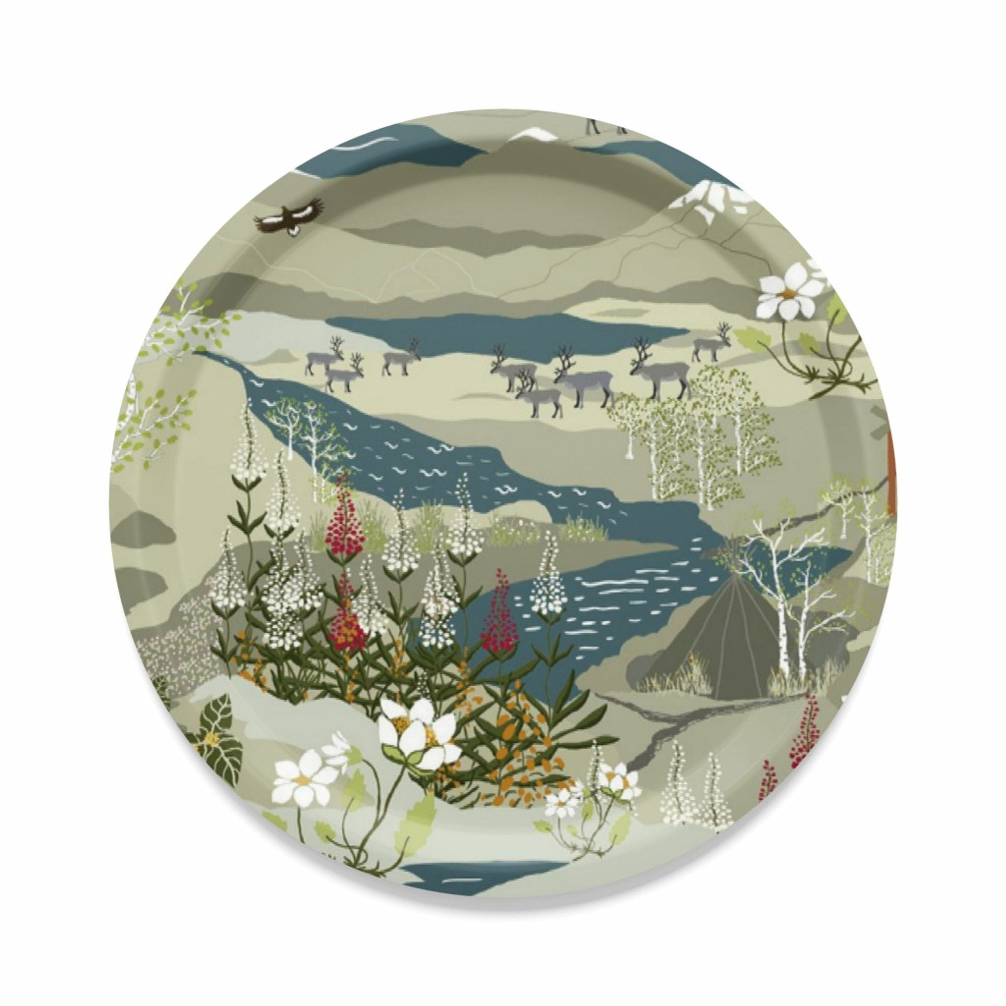 Upptäck den magiska skönheten i naturen med den turkosa rund brickan "Fjällvandring" från Arvidssons Textil. Denna unika bricka är prydd med ett vackert mönster som fångar essensen av fjällvandring, med renar, fjäll och porlande bäckar.