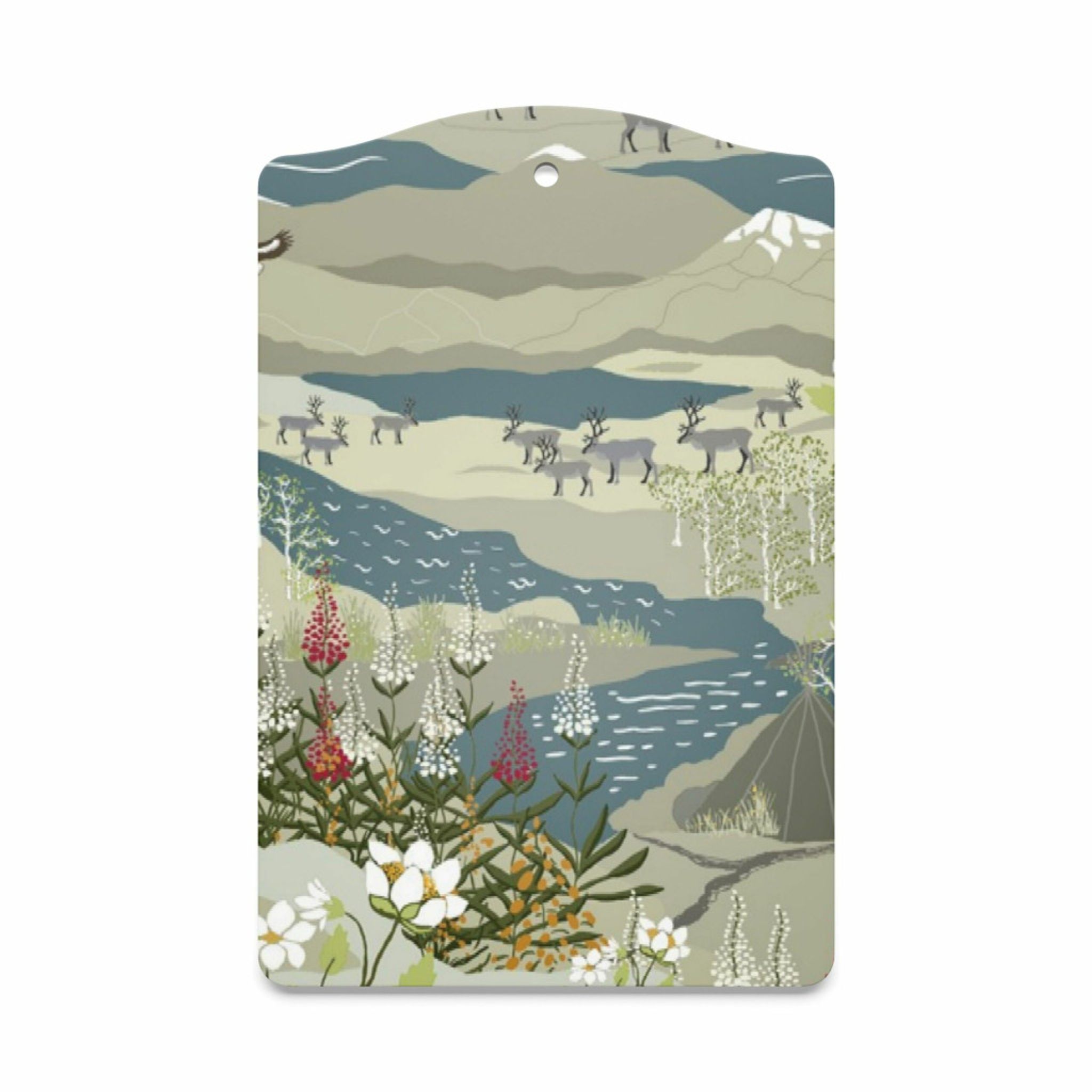 Upptäck den vackra Fjällvandring turkos serveringsbrädan från Arvidssons Textil, en perfekt kombination av funktion och konst. Denna serveringsbräda är prydd med det fantastiska tyget "Fjällvandring med Renar, Fjäll och Porlande Bäckar", som fångar den magiska stämningen av fjällnatur.