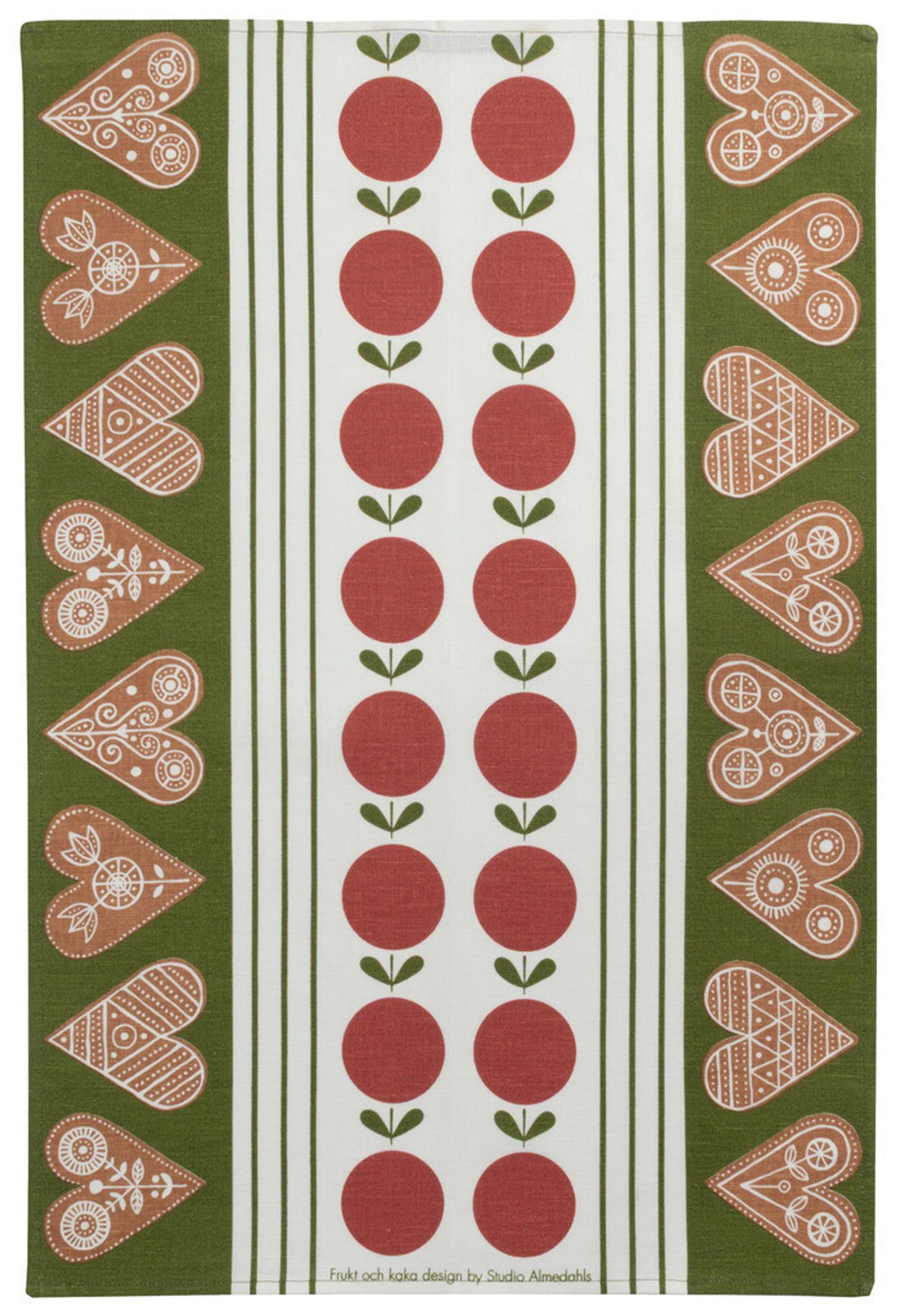 Ge ditt kök en festlig touch med kökshandduken Frukt och Kaka. Denna charmiga handduk pryds av röda äpplen och dekorerade pepparkakor, vilket gör den perfekt för julens alla tillfällen.