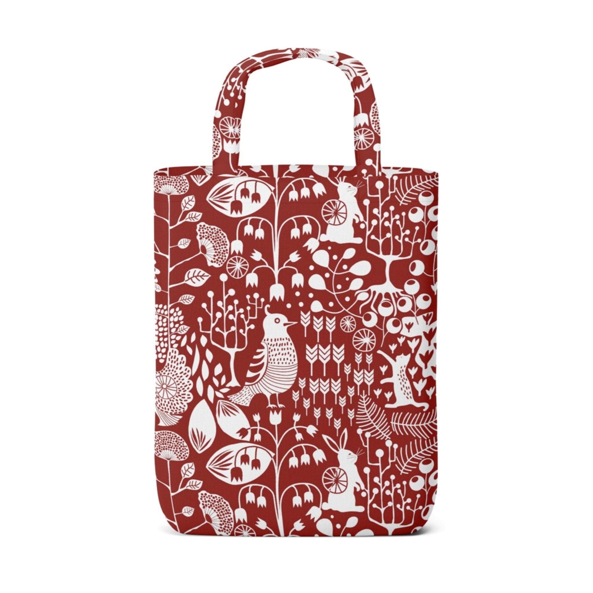- Design: röd bakgrund med ett naturnära mönster i vitt, skapad av Linda Svensson Edevint för Arvidssons Textil.
