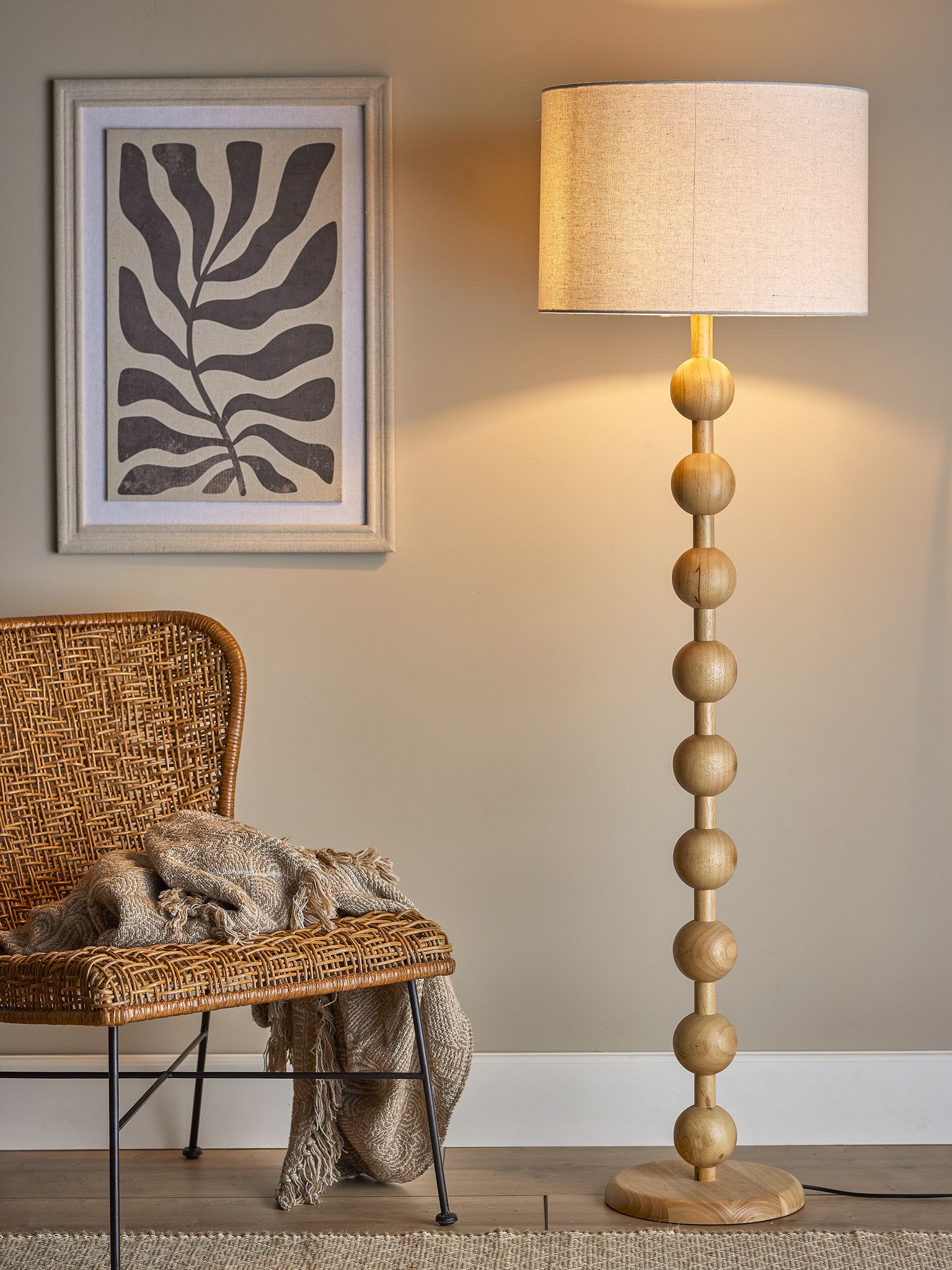 Giacoma golvlampa i naturfärgat gummiträ från Bloomingville är en golvlampa för vardagsrum och sovrum. Med sin skulpturala form blir den en dekorativ del av din inomhusbelysning och ger riktat ljus för läsning eller mys.