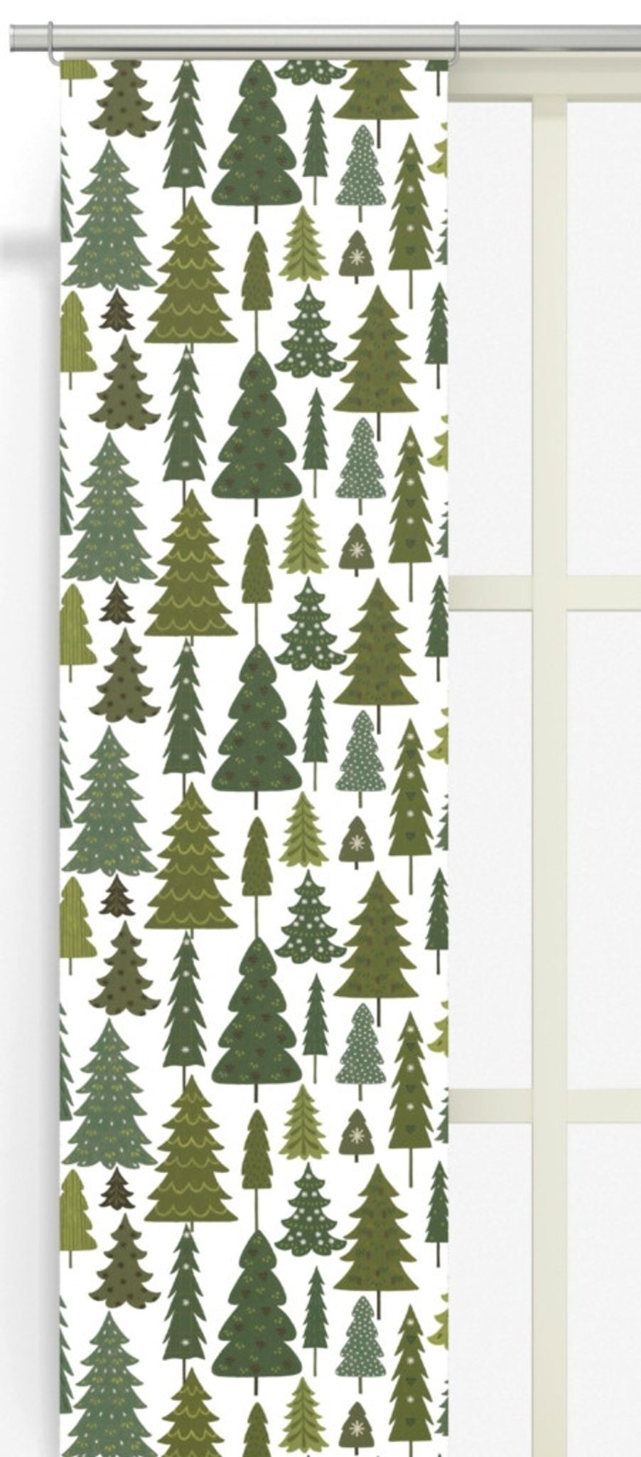 - Färg/mönster: Offwhite bakgrund med gröna granträd i olika nyanser
