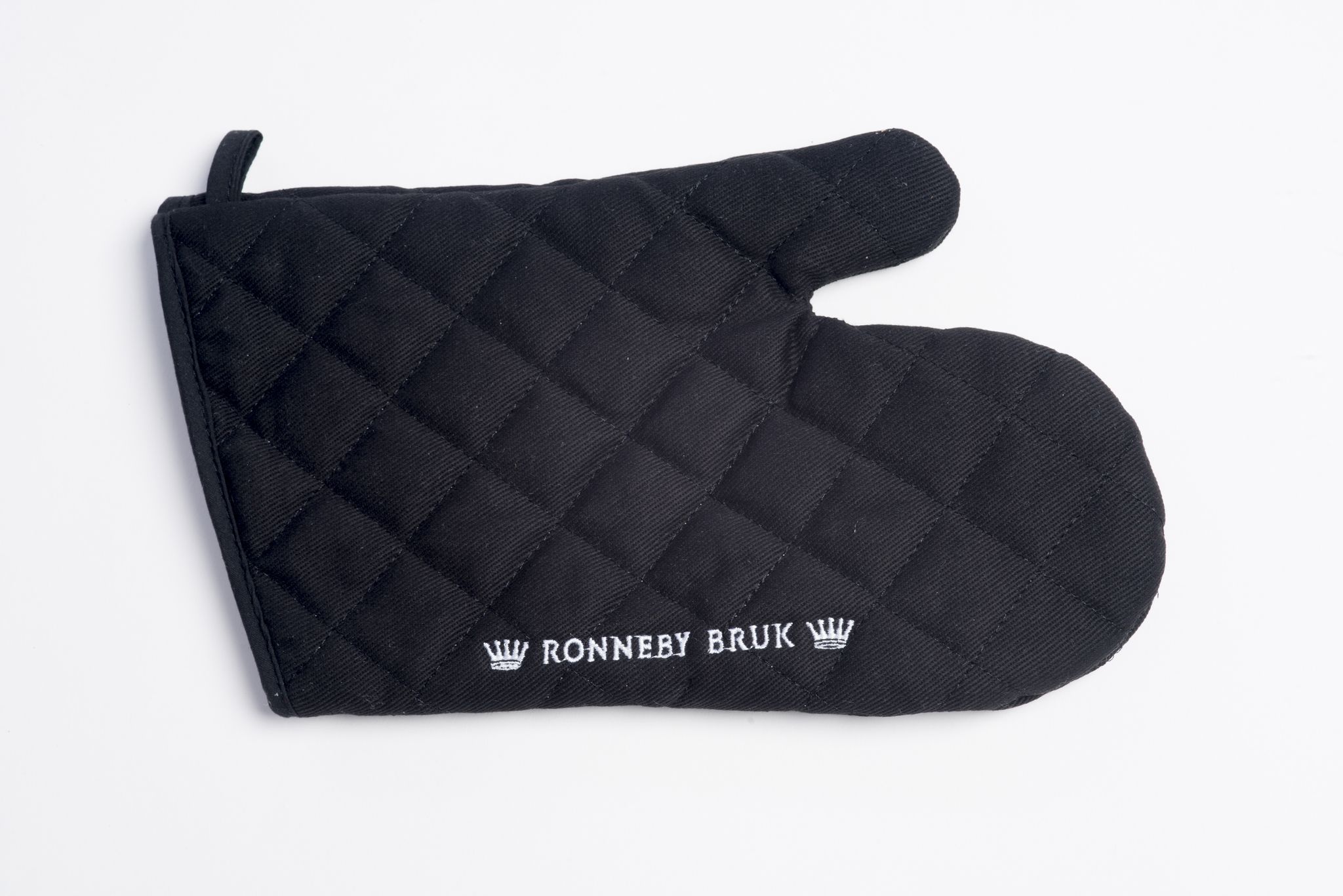 Upptäck Ronneby Bruks stiliga grill- och ugnsvante i svart quiltad bomull, perfekt för både vänster och höger hand med utmärkt värmeskydd.