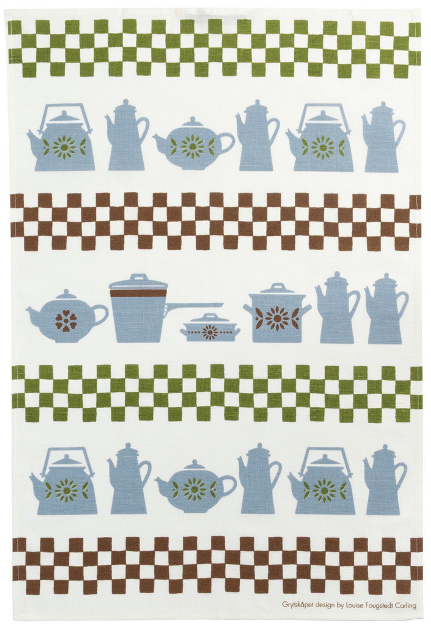 Upptäck Grytskåpet, en blågrön kökshandduk designad av Louise Fougstedt Carling med ett lekfullt mönster av kaffekannor och grytor.